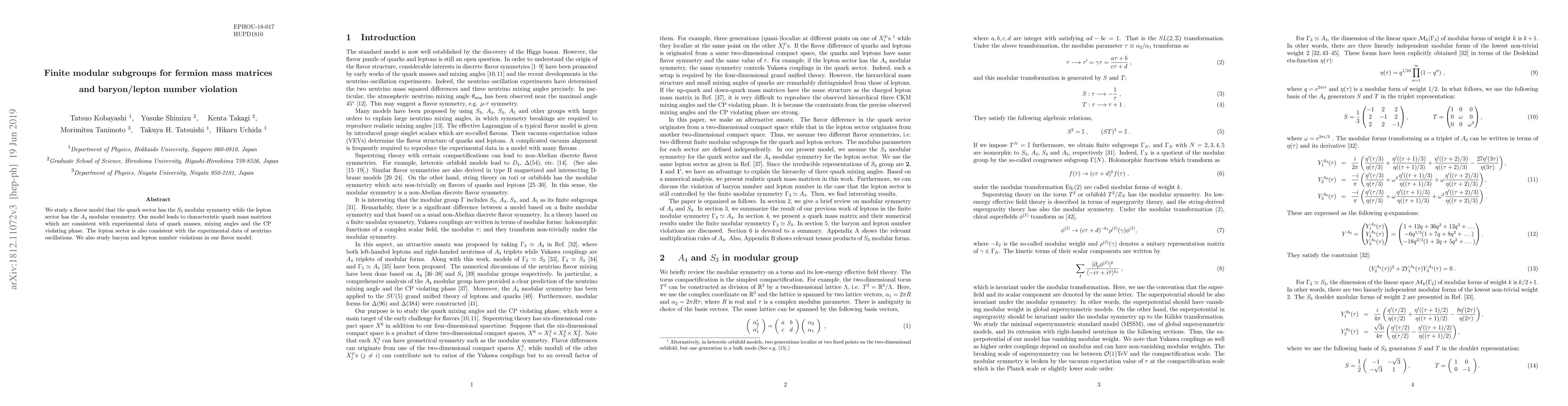 We study a flavor model that the quark sector has the $S_3$ modular symmetry,while the lepton sector has the $A_4$ modular symmetry. Our model leads to characteristic quark mass matrices which are consistent with experimental data of quark masses, mixing angles and the CP violating phase. The lepton sector is also consistent with the experimental data of neutrino oscillations. We also study baryon and lepton number violations in our flavor model.
