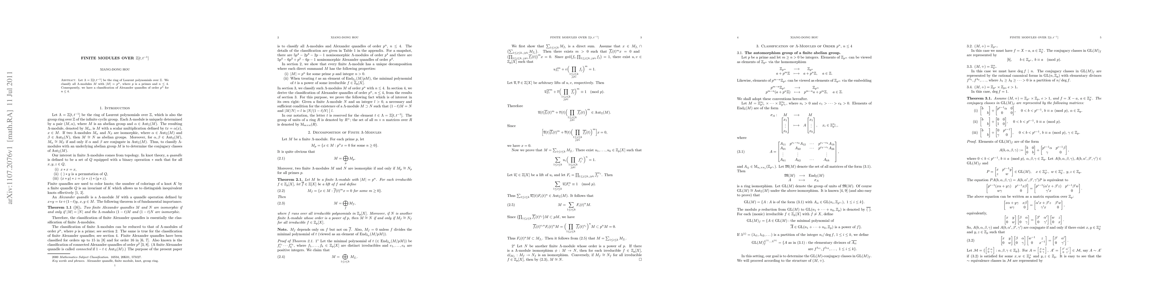 This paper classifies all finite $\Lambda=\Bbb Z[t,t^{-1}]$-modules of order $p^n$ for primes $p$ and $n\le 4$, providing a foundation for understanding Alexander quandles of similar orders.