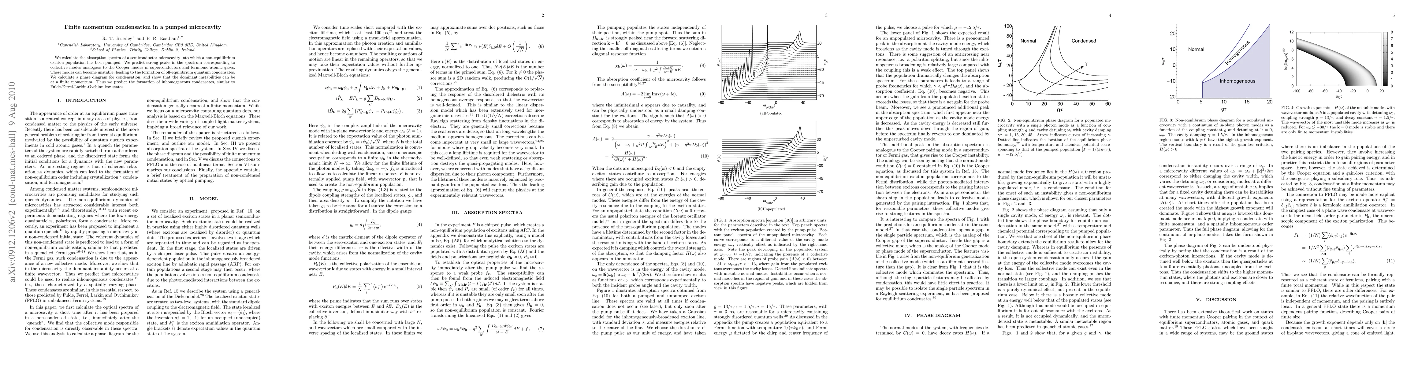 We calculate the absorption spectra of a semiconductor microcavity into which a non-equilibrium exciton population has been pumped. We predict strong peaks in the spectrum corresponding to collective modes analogous to the Cooper modes in superconductors and fermionic atomic gases. These modes can become unstable, leading to the formation of off-equilibrium quantum condensates. We calculate a phase diagram for condensation, and show that the dominant instabilities can be at a finite momentum. Thus we predict the formation of inhomogeneous condensates, similar to Fulde-Ferrel-Larkin-Ovchinnikov states.