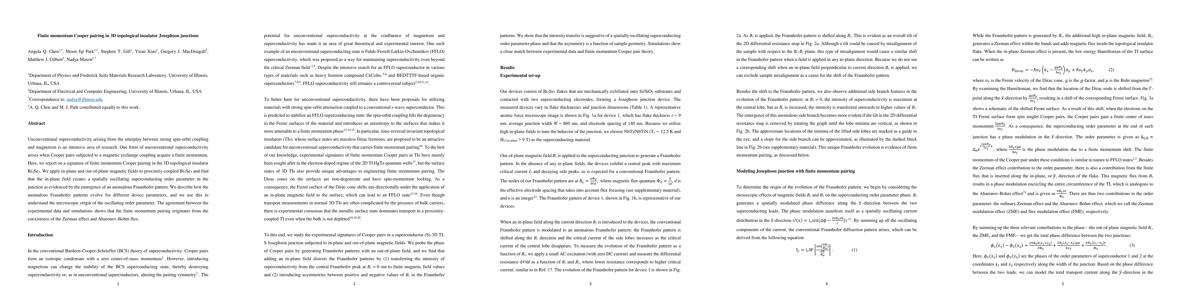 This paper investigates unconventional superconductivity in 3D topological insulator Josephson junctions, revealing finite momentum Cooper pairing through the emergence of an anomalous Fraunhofer pattern under in-plane magnetic fields. The study attributes this phenomenon to the interplay between the Zeeman effect and Aharonov-Bohm flux.