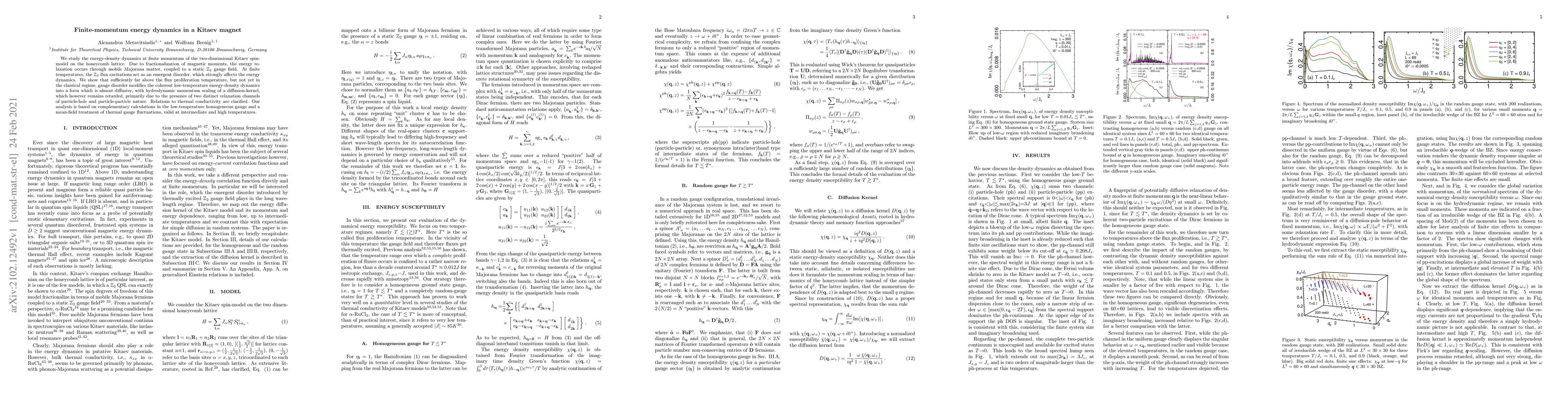 This paper investigates the energy dynamics at finite momentum in the Kitaev spin-model on a honeycomb lattice, revealing that fractionalized magnetic moments lead to energy relaxation via mobile Majorana matter. The study finds that gauge disorder at intermediate temperatures transforms the low-temperature energy dynamics into an almost diffusive form, with hydrodynamic momentum scaling, due to distinct particle-hole and particle-particle relaxation channels.