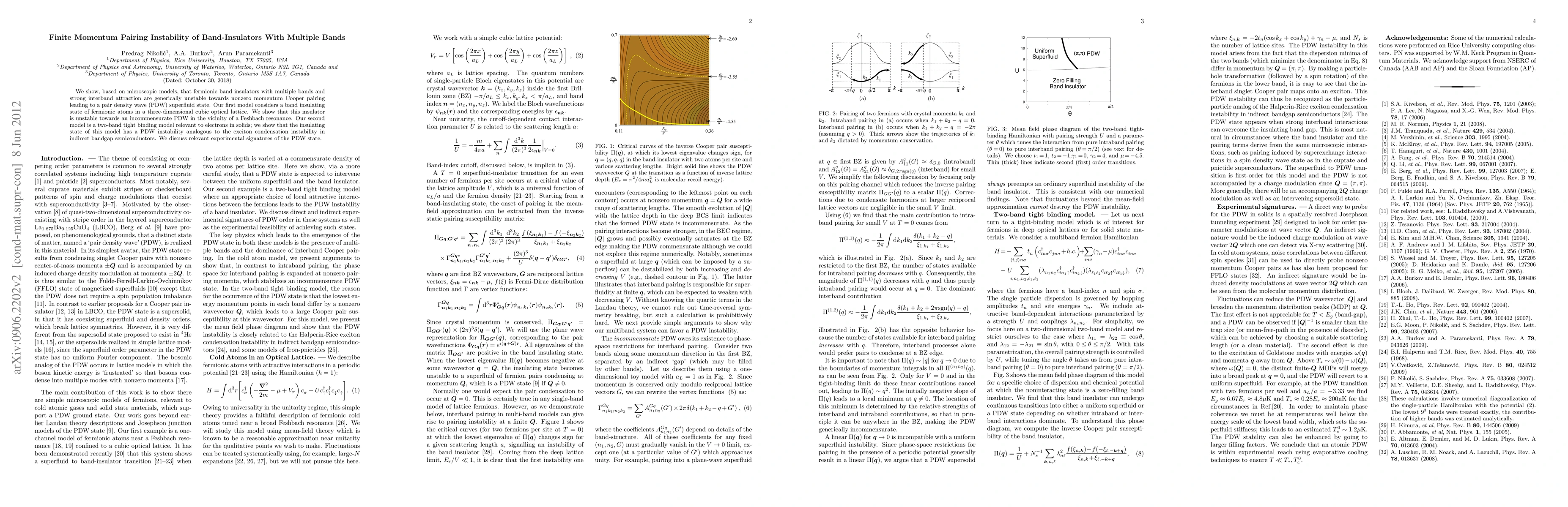We show, based on microscopic models, that fermionic band insulators with multiple bands and strong interband attraction are generically unstable towards nonzero momentum Cooper pairing leading to a pair density wave (PDW) superfluid state. Our first model considers a band insulating state of fermionic atoms in a three-dimensional cubic optical lattice. We show that this insulator is unstable towards an incommensurate PDW in the vicinity of a Feshbach resonance. Our second model is a two-band tight binding model relevant to electrons in solids; we show that the insulating state of this model has a PDW instability analogous to the exciton condensation instability in indirect bandgap semiconductors. We discuss relevant experimental signatures of the PDW state.