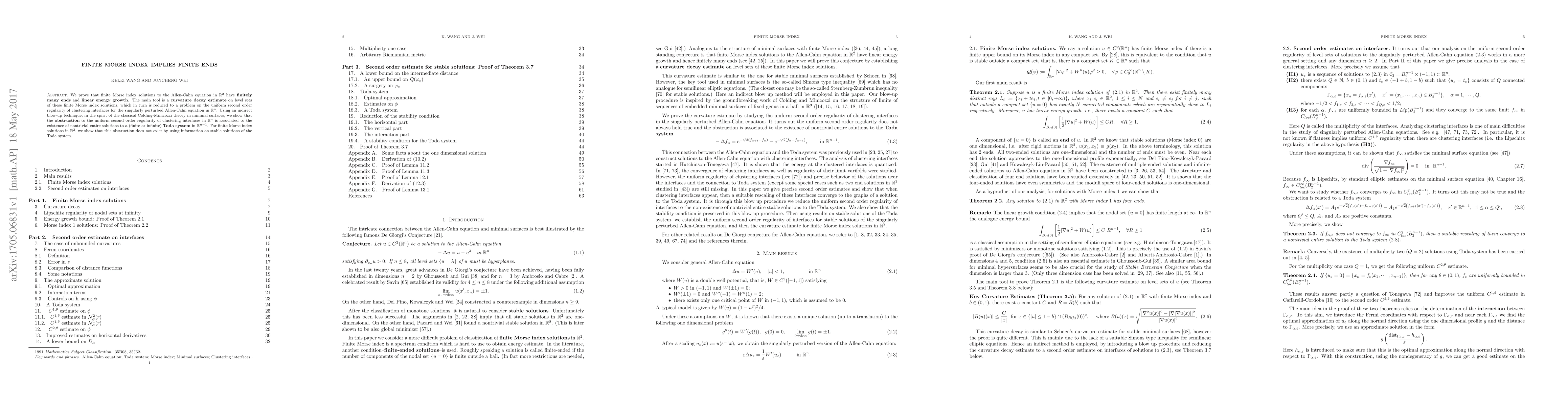 We prove that finite Morse index solutions to the Allen-Cahn equation in $\R^2$ have {\bf finitely many ends} and {\bf linear energy growth}. The main tool is a {\bf curvature decay estimate} on level sets of these finite Morse index solutions, which in turn is reduced to a problem on the uniform second order regularity of clustering interfaces for the singularly perturbed Allen-Cahn equation in $\R^n$. Using an indirect blow-up technique, in the spirit of the classical Colding-Minicozzi theory in minimal surfaces, we show that the {\bf obstruction} to the uniform second order regularity of clustering interfaces in $\R^n$ is associated to the existence of nontrivial entire solutions to a (finite or infinite) {\bf Toda system} in $\R^{n-1}$. For finite Morse index solutions in $\R^2$, we show that this obstruction does not exist by using information on stable solutions of the Toda system.