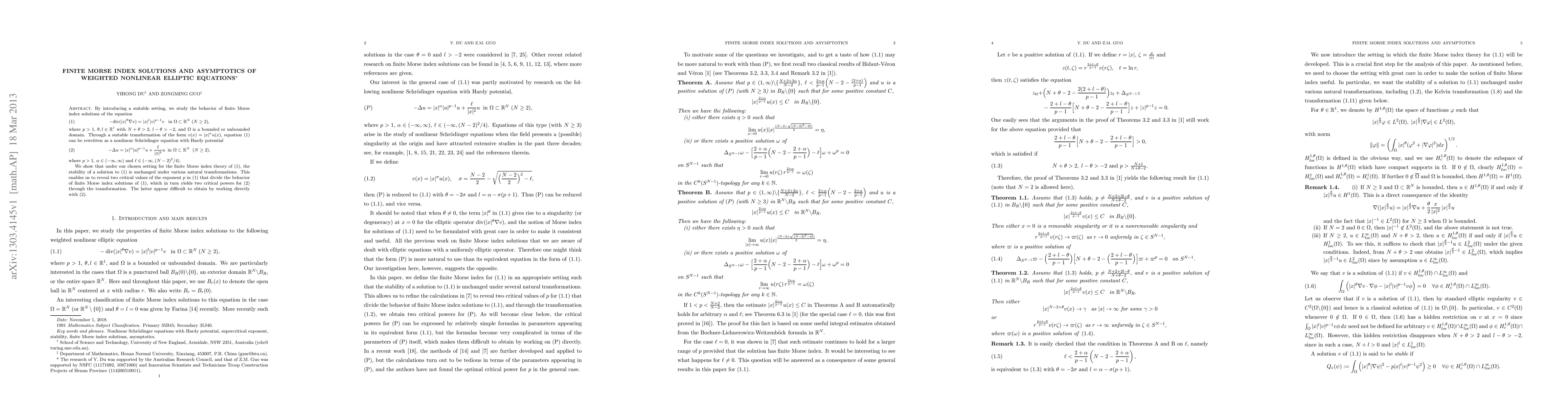By introducing a suitable setting, we study the behavior of finite Morse index solutions of the equation \[ -\{div} (|x|^\theta \nabla v)=|x|^l |v|^{p-1}v \;\;\; \{in $\Omega \subset \R^N \; (N \geq 2)$}, \leqno(1) \] where $p>1$, $\theta, l\in\R^1$ with $N+\theta>2$, $l-\theta>-2$, and $\Omega$ is a bounded or unbounded domain. Through a suitable transformation of the form $v(x)=|x|^\sigma u(x)$, equation (1) can be rewritten as a nonlinear Schr\"odinger equation with Hardy potential $$-\Delta u=|x|^\alpha |u|^{p-1}u+\frac{\ell}{|x|^2} u \;\; \{in $\Omega \subset \R^N \;\; (N \geq 2)$}, \leqno{(2)}$$ where $p>1$, $\alpha \in (-\infty, \infty)$ and $\ell \in (-\infty,(N-2)^2/4)$. We show that under our chosen setting for the finite Morse index theory of (1), the stability of a solution to (1) is unchanged under various natural transformations. This enables us to reveal two critical values of the exponent $p$ in (1) that divide the behavior of finite Morse index solutions of (1), which in turn yields two critical powers for (2) through the transformation. The latter appear difficult to obtain by working directly with (2).