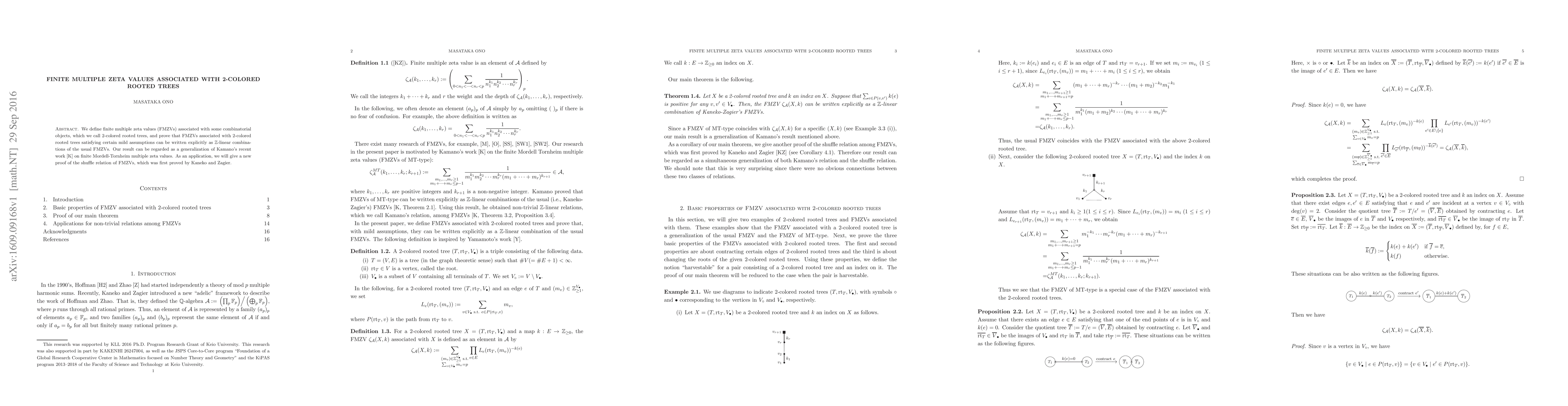 This paper introduces finite multiple zeta values (FMZVs) linked to 2-colored rooted trees and demonstrates they can be expressed as $\mathbb{Z}$-linear combinations of standard FMZVs. The result extends Kamano's work and provides a new proof for the shuffle relation of FMZVs originally established by Kaneko and Zagier.