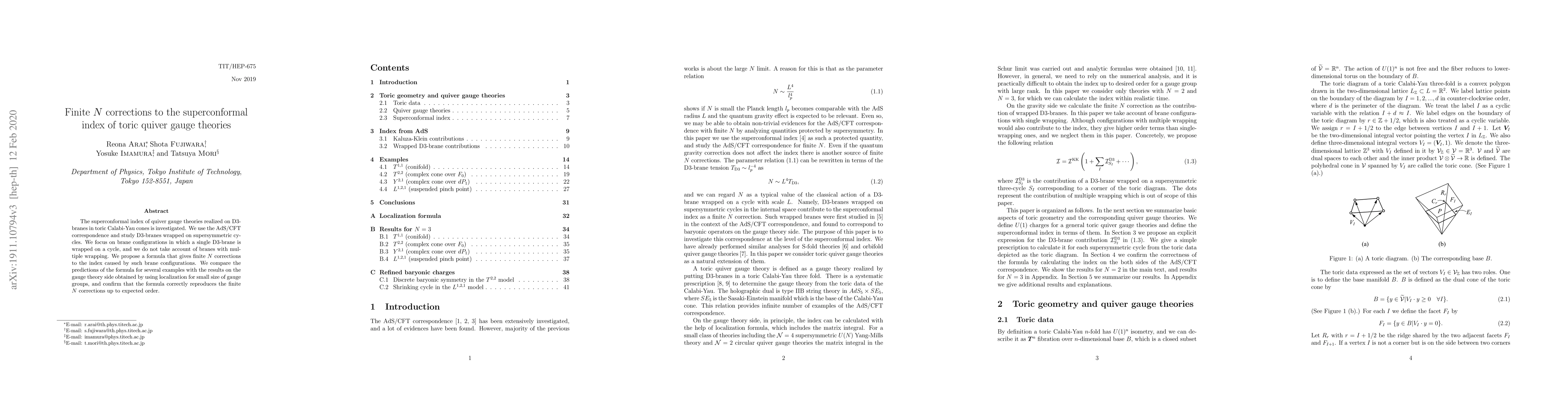 This paper proposes a formula to calculate finite $N$ corrections to the superconformal index of toric quiver gauge theories, using the AdS/CFT correspondence and D3-branes wrapped on supersymmetric cycles. The formula is validated by comparing its predictions with localization results on the gauge theory side for small gauge group sizes.