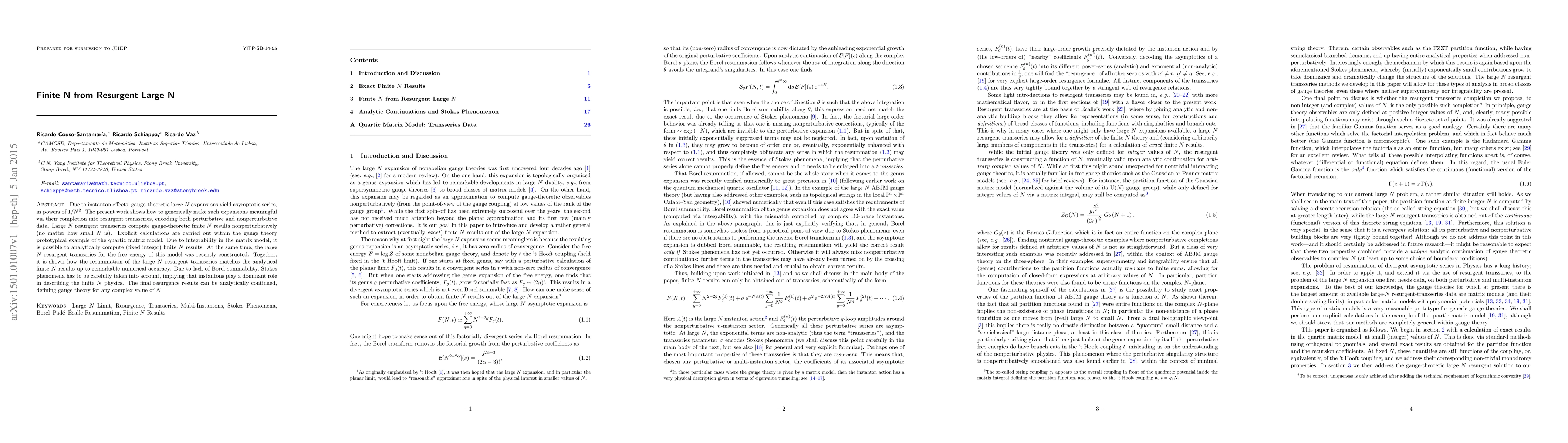 Due to instanton effects, gauge-theoretic large N expansions yield asymptotic series, in powers of 1/N^2. The present work shows how to generically make such expansions meaningful via their completion into resurgent transseries, encoding both perturbative and nonperturbative data. Large N resurgent transseries compute gauge-theoretic finite N results nonperturbatively (no matter how small N is). Explicit calculations are carried out within the gauge theory prototypical example of the quartic matrix model. Due to integrability in the matrix model, it is possible to analytically compute (fixed integer) finite N results. At the same time, the large N resurgent transseries for the free energy of this model was recently constructed. Together, it is shown how the resummation of the large N resurgent transseries matches the analytical finite N results up to remarkable numerical accuracy. Due to lack of Borel summability, Stokes phenomena has to be carefully taken into account, implying that instantons play a dominant role in describing the finite N physics. The final resurgence results can be analytically continued, defining gauge theory for any complex value of N.