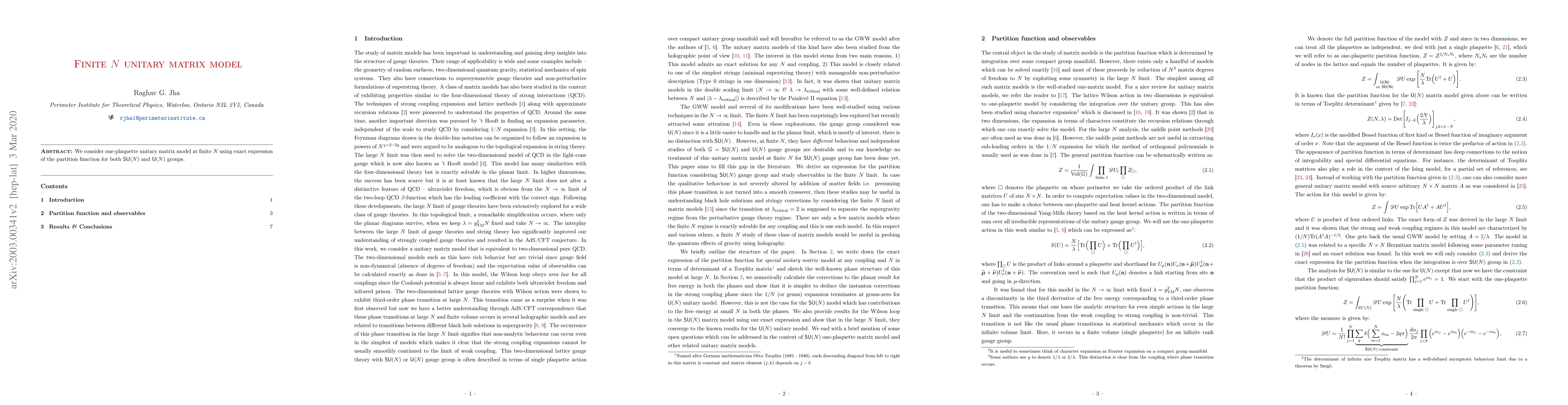 Summary: This paper examines the one-plaquette unitary matrix model at finite $N$ for both SU($N$) and U($N$) groups, utilizing exact expressions for their partition functions to derive analytical results.