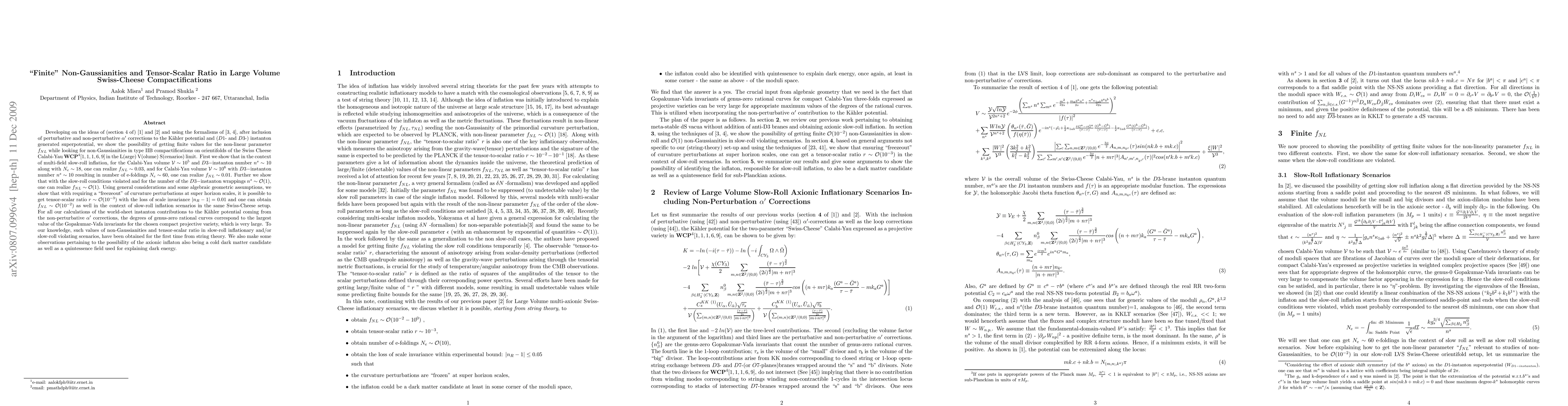 Developing on the ideas of (section 4 of) [1] and [2] and using the formalisms of [3] and [4], after inclusion of perturbative and non-perturbative alpha' corrections to the Kaehler potential and (D1- and D3-) instanton generated superpotential, we show the possibility of getting finite values for the non-linear parameter f_{NL} while looking for non-Gaussianities in type IIB compactifications on orientifolds of the Swiss Cheese Calabi-Yau WCP^4[1,1,1,6,9] in the L(arge) V(olume) S(cenarios) limit. First we show that in the context of multi-field slow-roll inflation, for the Calabi-Yau volume V~10^5 and D3-instanton number n^s~10 along with N_e~18, one can realize f_{NL}~0.03, and for Calabi-Yau volume V~10^6 with D3-instanton number n^s~10 resulting in number of e-foldings N_e~60, one can realize f_{NL}~0.01. Further we show that with the slow-roll conditions violated and for the number of the D3-instanton wrappings n^s ~O(1), one can realize f_{NL} ~O(1). Using general considerations and some algebraic geometric assumptions, we show that with requiring a "freezeout" of curvature perturbations at super horizon scales, it is possible to get tensor-scalar ratio r ~O(10^{-3}) with the loss of scale invariance |n_R-1|=0.01 and one can obtain f_{NL} ~O(10^{-2}) as well in the context of slow-roll inflation scenarios in the same Swiss-Cheese setup. For all our calculations the large values of the genus-zero Gopakumar-Vafa invariants for compact projective varieties, play in important role. We also make some observations pertaining to the possibility of the axionic inflaton also being a cold dark matter candidate as well as a quintessence field used for explaining dark energy.