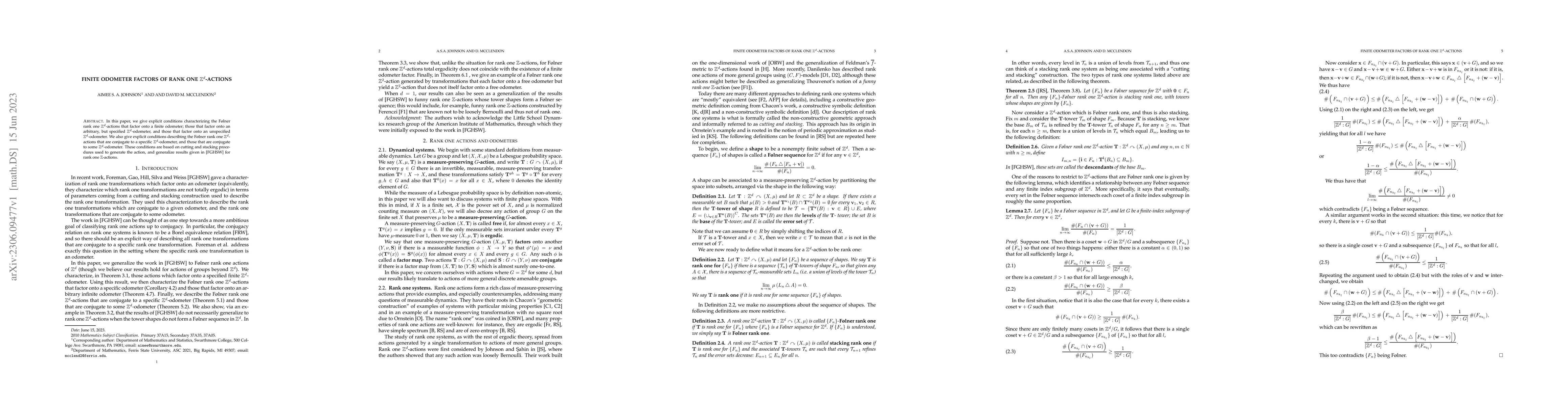 This paper provides explicit conditions for F{\o}lner rank one $\mathbb{Z}^d$-actions that factor onto finite odometers, specifying conditions for actions that factor onto a given or any $\mathbb{Z}^d$-odometer, and those that are conjugate to a specific or any $\mathbb{Z}^d$-odometer. These conditions are derived from cutting and stacking procedures and generalize prior results for rank one $\mathbb{Z}$-actions.