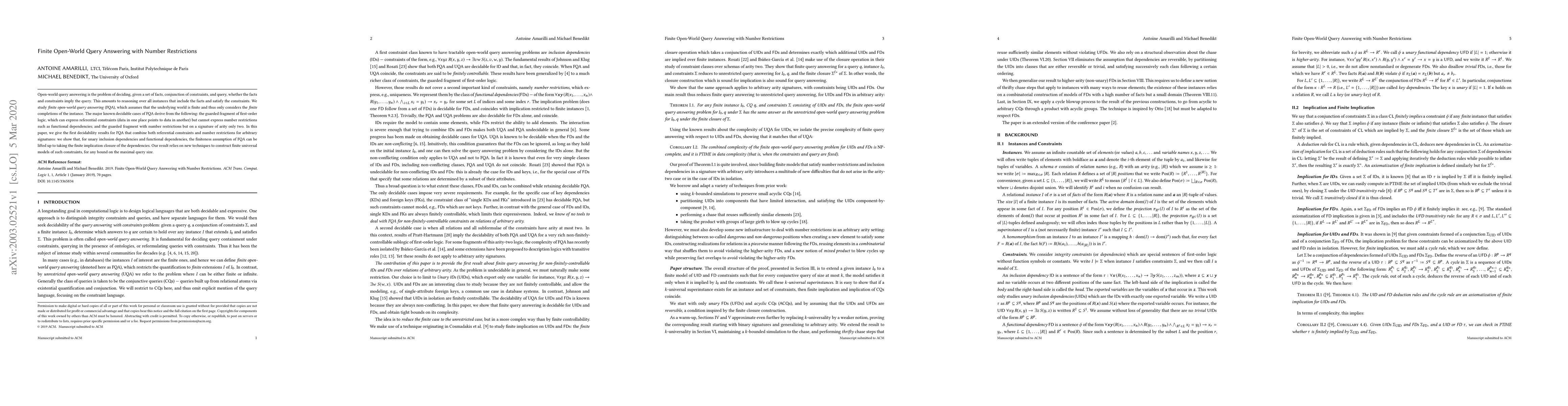 This paper presents decidability results for finite open-world query answering (FQA) that combine referential constraints and number restrictions for any signature. It introduces new techniques to construct finite universal models for arbitrary bounds on query size, lifting the finiteness assumption.