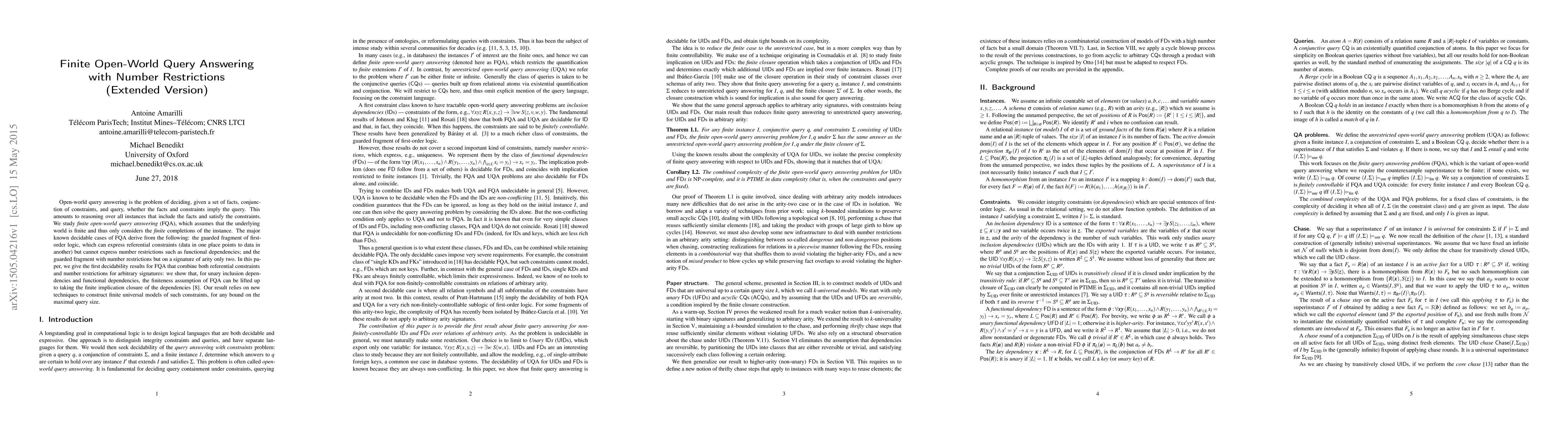 This paper presents decidability results for finite open-world query answering (FQA) that combine referential constraints and number restrictions for any signature. It introduces new techniques to construct finite universal models, enabling the handling of unary inclusion dependencies and functional dependencies.