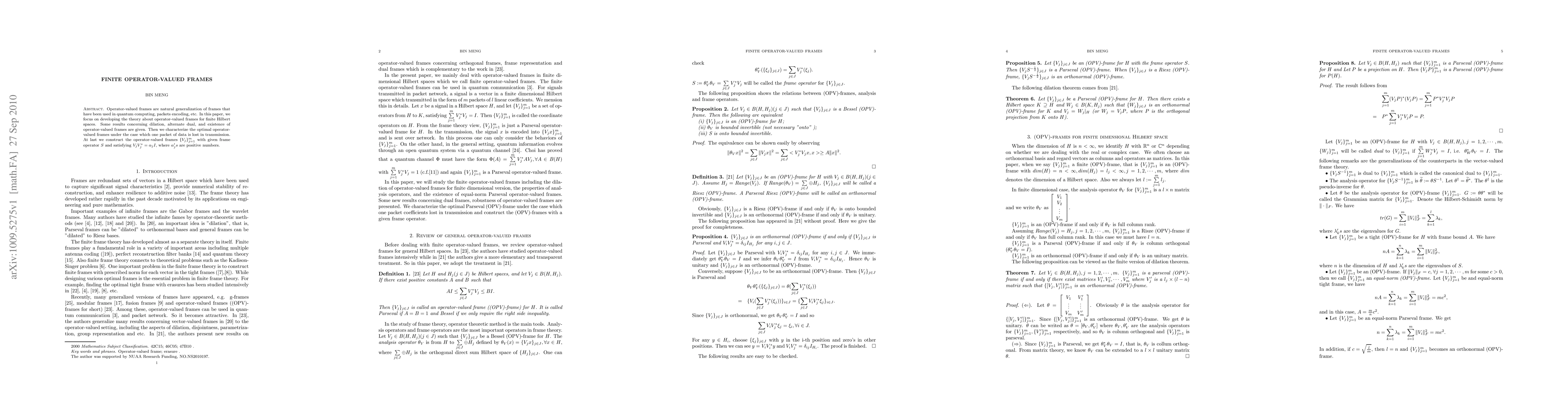 This paper develops the theory of operator-valued frames for finite Hilbert spaces, addressing dilation, alternate dual, and existence. It also characterizes optimal frames for data loss scenarios and constructs frames with specified properties.