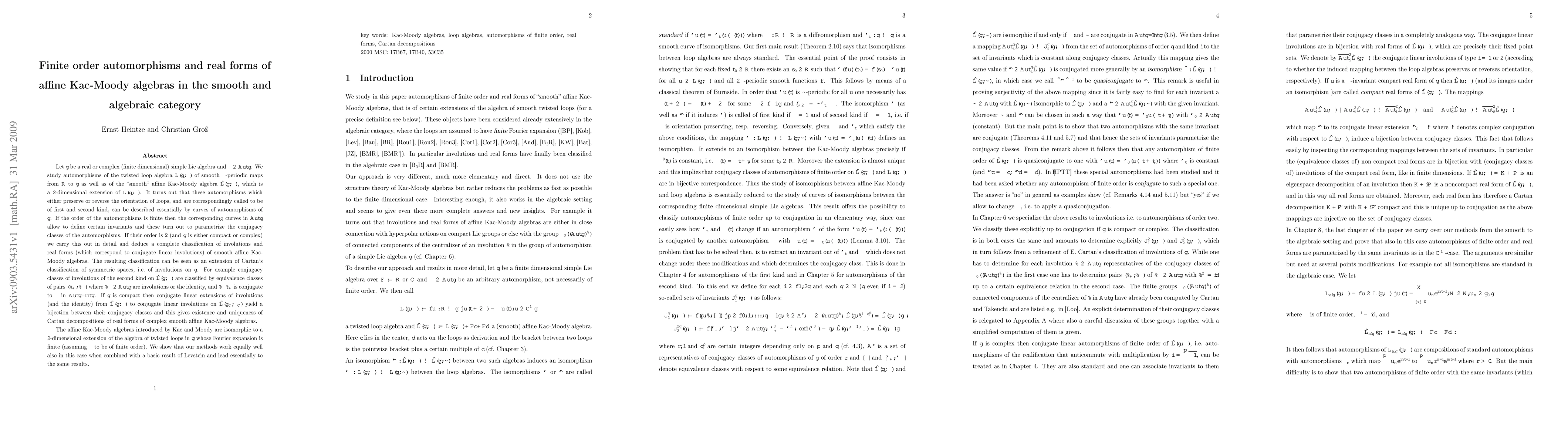 This paper examines finite order automorphisms and real forms of smooth affine Kac-Moody algebras, demonstrating their parametrization by specific invariants. It concludes that the classification of involutions aligns with Cartan's finite-dimensional classifications and extends these findings to the algebraic setting as well.