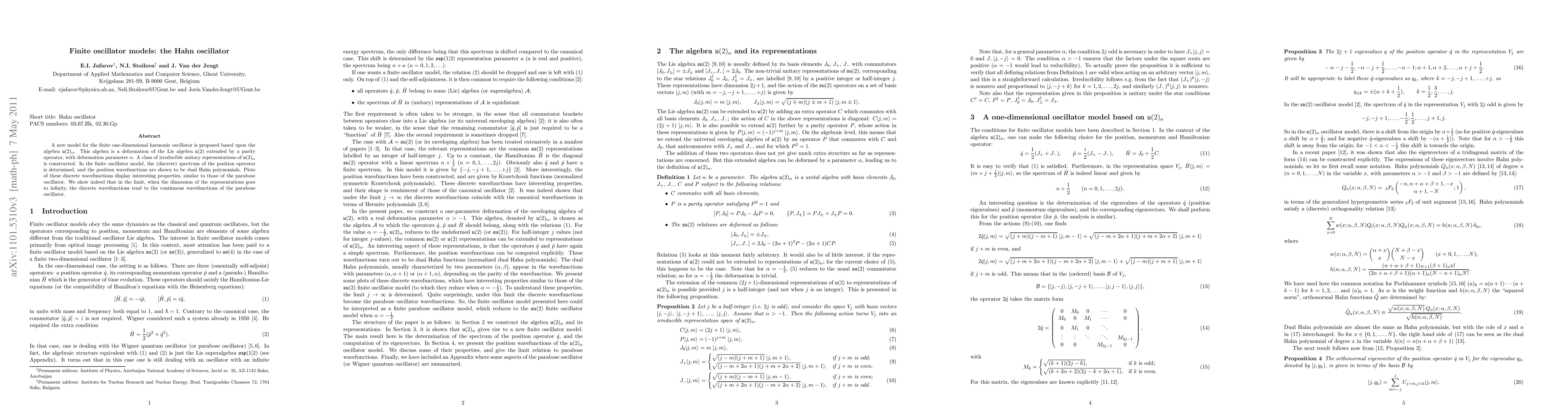 A new model for the finite one-dimensional harmonic oscillator is proposed based upon the algebra u(2)_{\alpha}. This algebra is a deformation of the Lie algebra u(2) extended by a parity operator, with deformation parameter {\alpha}. A class of irreducible unitary representations of u(2)_{\alpha} is constructed. In the finite oscillator model, the (discrete) spectrum of the position operator is determined, and the position wave functions are shown to be dual Hahn polynomials. Plots of these discrete wave functions display interesting properties, similar to those of the parabose oscillator. We show indeed that in the limit, when the dimension of the representations goes to infinity, the discrete wave functions tend to the continuous wave functions of the parabose oscillator.