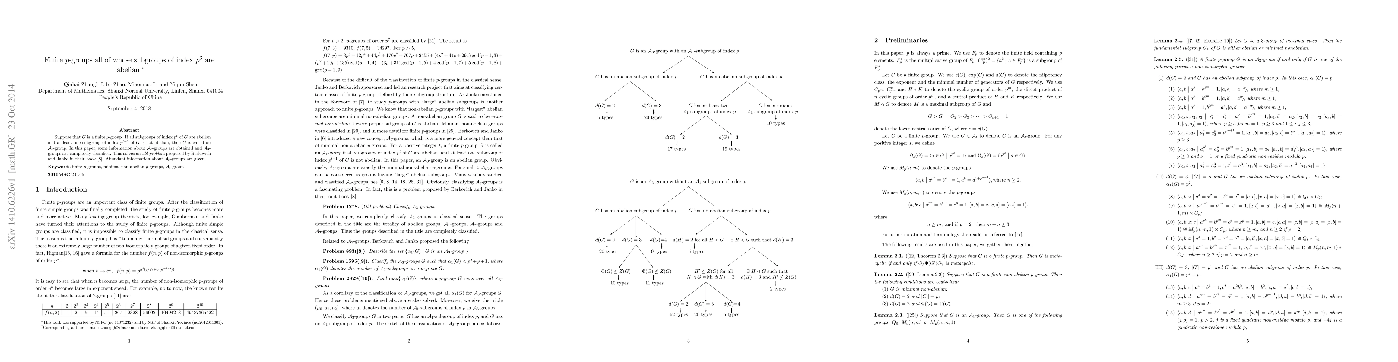 Suppose that $G$ is a finite $p$-group. If all subgroups of index $p^t$ of $G$ are abelian and at least one subgroup of index $p^{t-1}$ of $G$ is not abelian, then $G$ is called an $\mathcal{A}_t$-group. In this paper, some information about $\mathcal{A}_t$-groups are obtained and $\mathcal{A}_3$-groups are completely classified. This solves an {\it old problem} proposed by Berkovich and Janko in their book. Abundant information about $\mathcal{A}_3$-groups are given.