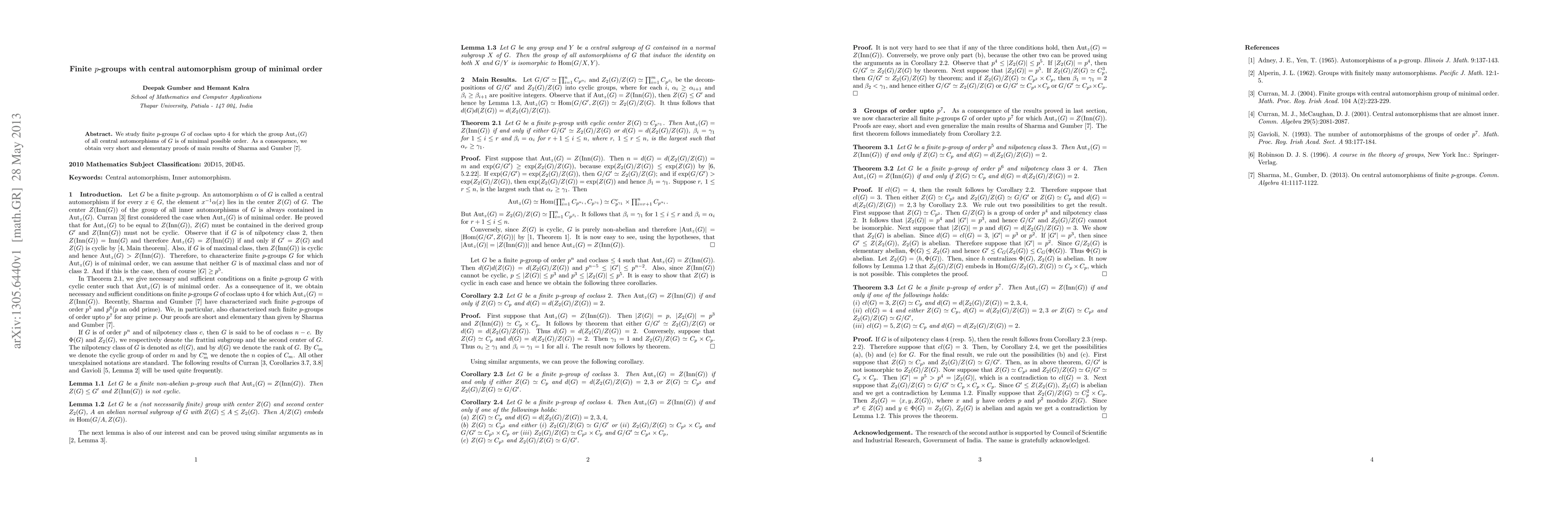 This paper investigates finite p-groups with coclass up to 4 where the central automorphism group has minimal order, providing concise proofs for key results previously established by Sharma and Gumber.