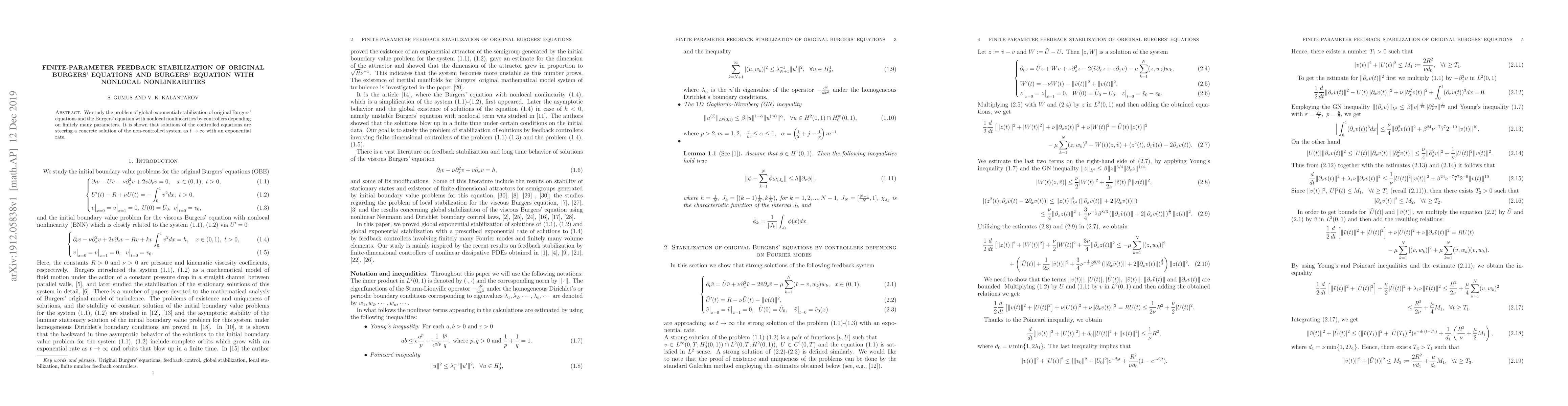 We study the problem of global exponential stabilization of original Burgers' equations and the Burgers' equation with nonlocal nonlinearities by controllers depending on finitely many parameters. It is shown that solutions of the controlled equations are steering a concrete solution of the non-controlled system as $t\rightarrow \infty$ with an exponential rate.