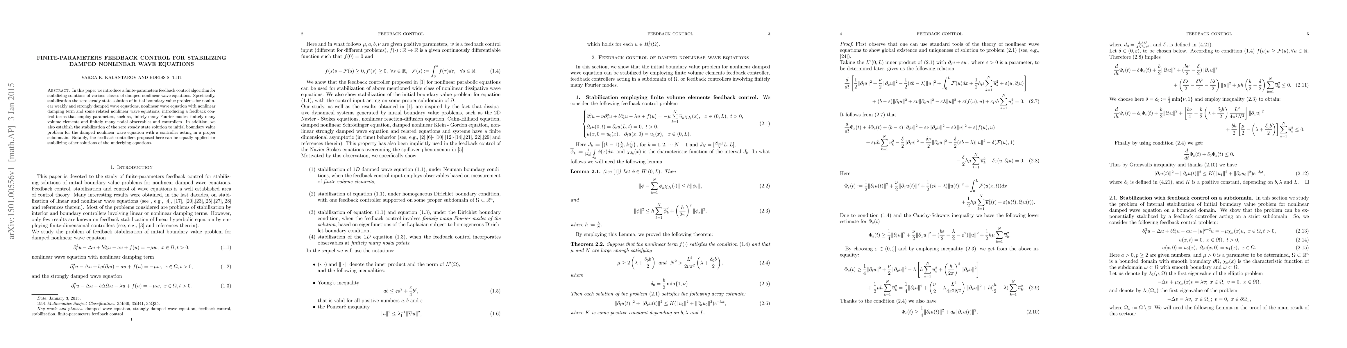 This paper presents a finite-parameters feedback control algorithm to stabilize various damped nonlinear wave equations, including weakly and strongly damped cases, and those with nonlinear damping terms. The proposed method utilizes finitely many Fourier modes, volume elements, and nodal observables for effective control.