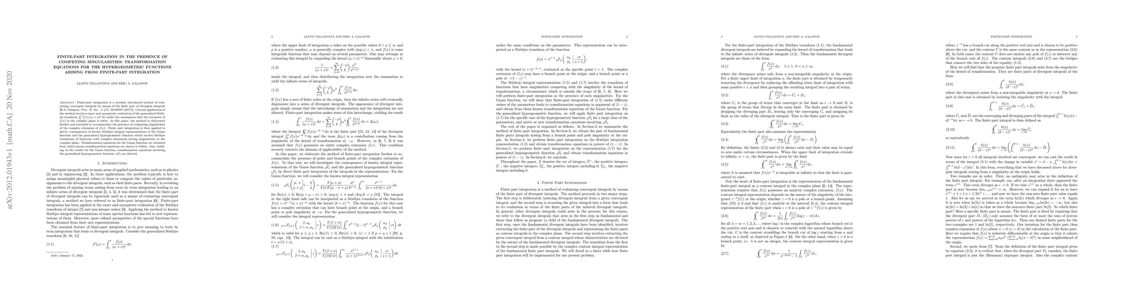 This paper extends finite-part integration to handle competing singularities in the complex plane, applying it to derive transformation equations for the Gauss function and generalized hypergeometric functions $\,_3F_2$. Known transformation equations for these functions are shown to follow from the new results.