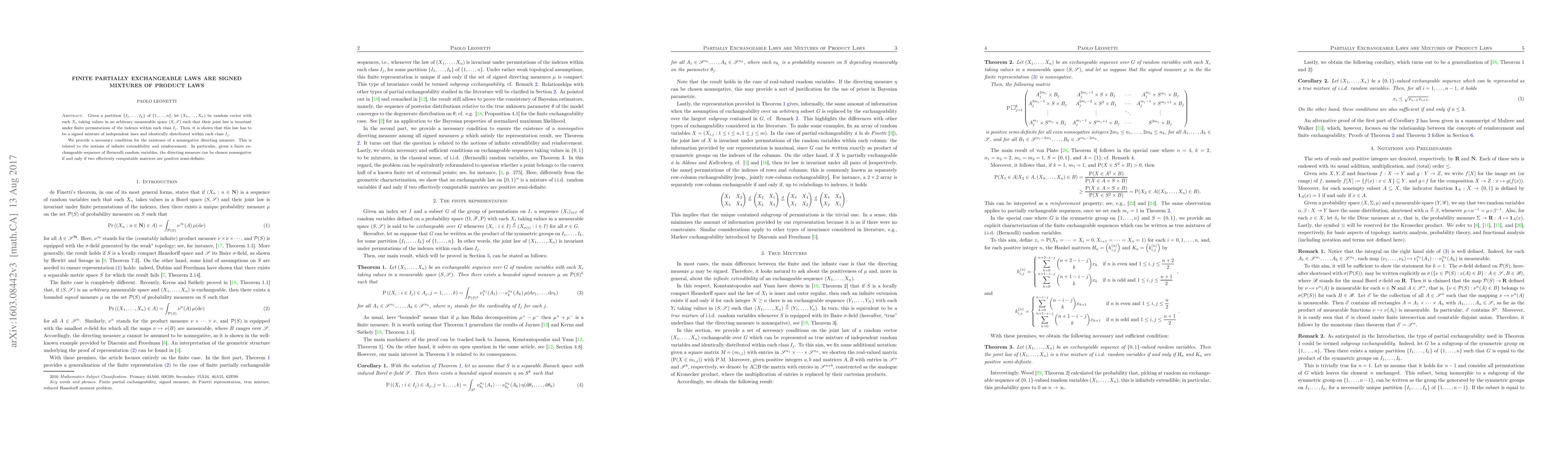 A research paper shows that finite partially exchangeable laws can be represented as signed mixtures of product laws, with the representation being unique under certain conditions. The existence of a nonnegative directing measure is related to concepts like infinite extendibility and reinforcement.
