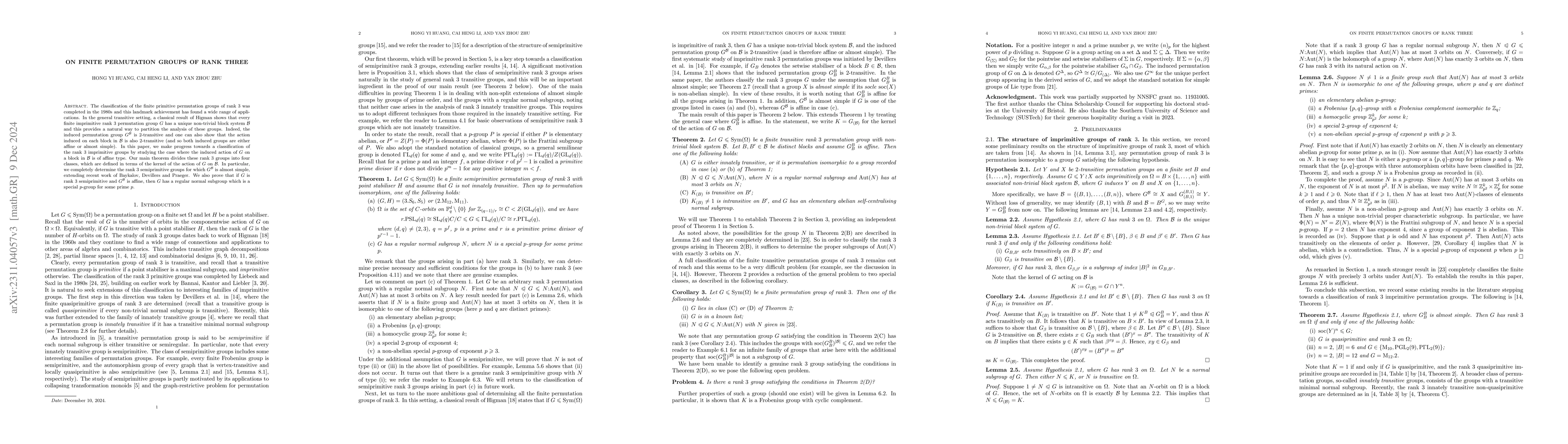The classification of the finite primitive permutation groups of rank $3$ was completed in the 1980s and this landmark achievement has found a wide range of applications. In the general transitive setting, a classical result of Higman shows that every finite imprimitive rank $3$ permutation group $G$ has a unique non-trivial block system $\mathcal{B}$ and this provides a natural way to partition the analysis of these groups. Indeed, the induced permutation group $G^{\mathcal{B}}$ is $2$-transitive and one can also show that the action induced on each block in $\mathcal{B}$ is also $2$-transitive (and so both induced groups are either affine or almost simple). In this paper, we make progress towards a classification of the rank $3$ imprimitive groups by studying the case where the induced action of $G$ on a block in $\mathcal{B}$ is of affine type. Our main theorem divides these rank $3$ groups into four classes, which are defined in terms of the kernel of the action of $G$ on $\mathcal{B}$. In particular, we completely determine the rank $3$ semiprimitive groups for which $G^{\mathcal{B}}$ is almost simple, extending recent work of Baykalov, Devillers and Praeger. We also prove that if $G$ is rank $3$ semiprimitive and $G^{\mathcal{B}}$ is affine, then $G$ has a regular normal subgroup which is a special $p$-group for some prime $p$.