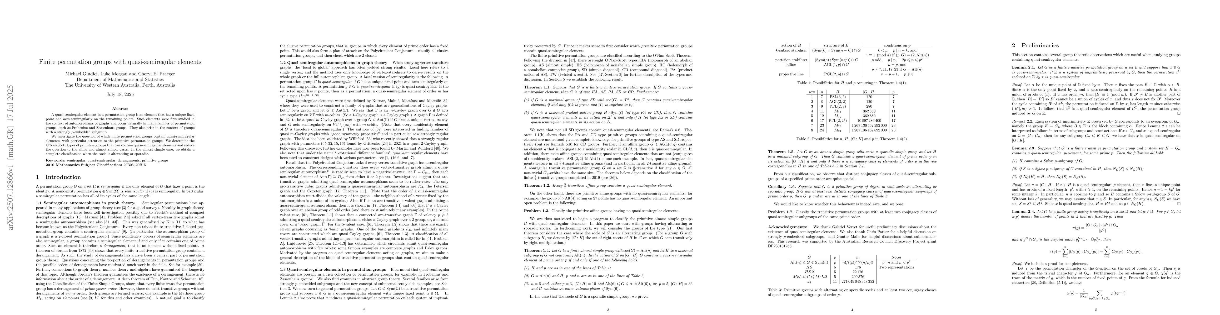 A quasi-semiregular element in a permutation group is an element that has a unique fixed point and acts semiregularly on the remaining points. Such elements were first studied in the context of automorphisms of graphs and occur naturally in many families of permutation groups, such as Frobenius and Zassenhaus groups. They also arise in the context of groups with a strongly $p$-embedded subgroup. We investigate the question of which finite permutation groups contain quasi-semiregular elements, with particular attention to the primitive permutation groups. We determine the O'Nan-Scott types of primitive groups that can contain quasi-semiregular elements and reduce the question to the affine and almost simple cases. In the almost simple case, we obtain a complete classification when the socle is alternating or sporadic.