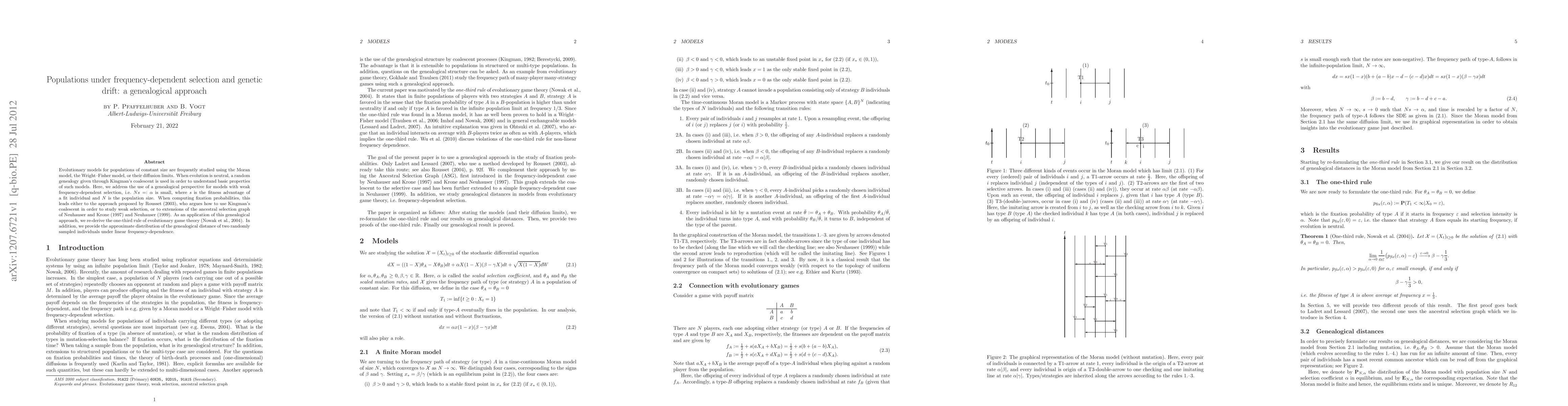 This paper explores the application of genealogical methods, such as Kingman's coalescent, to evolutionary models with weak frequency-dependent selection. It re-derives the one-third law of evolutionary game theory and provides an approximate distribution for the genealogical distance under linear frequency-dependence.