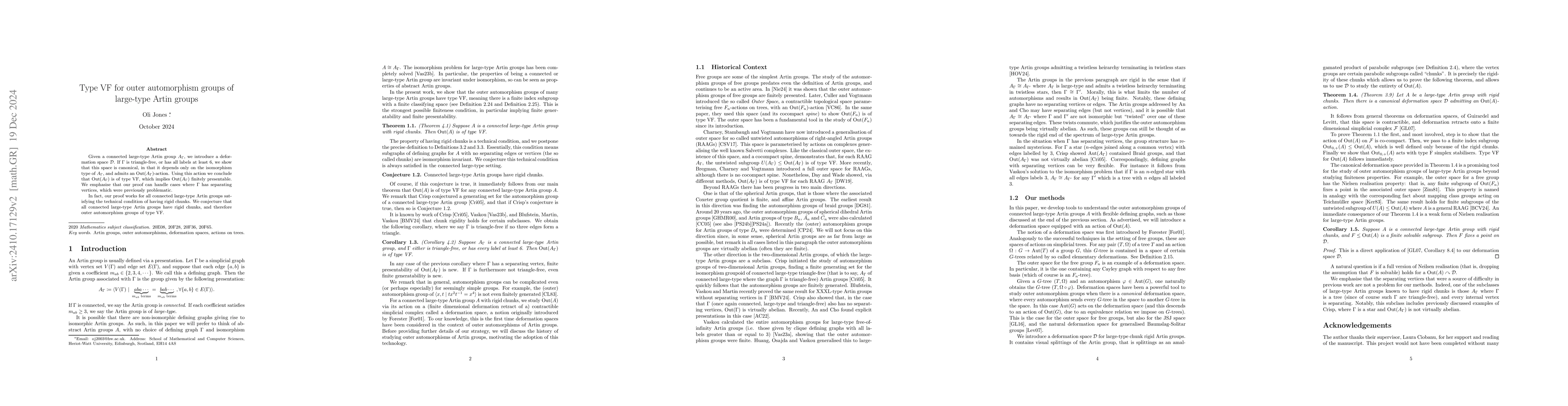 Given a connected large-type Artin group $A_\Gamma$, we introduce a deformation space $\mathcal{D}$. If $\Gamma$ is triangle-free, or has all labels at least 6, we show that this space is canonical, in that it depends only on the isomorphism type of $A_\Gamma$, and admits an $\mathrm{Out}(A_\Gamma)$-action. Using this action we conclude that $\mathrm{Out}(A_\Gamma)$ is finitely presentable. We emphasise that our proof can handle cases where $\Gamma$ has separating vertices, which were previously problematic. In fact, our proof works for all connected large-type Artin groups satisfying the technical condition of having rigid chunks. We conjecture that all connected large-type Artin groups have rigid chunks, and therefore finitely presented outer automorphism groups.