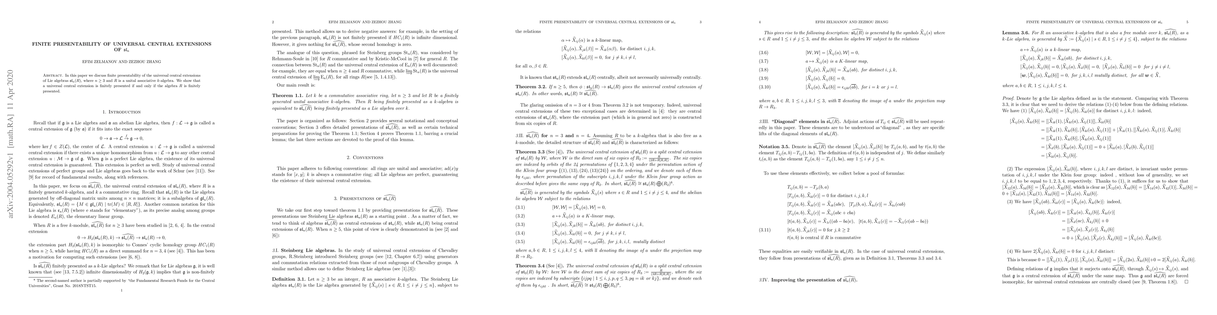 Summary: This paper investigates the finite presentability of universal central extensions of the Lie algebra ${\mathfrak{sl}_n(R)}$ for $n\geq 3$. It concludes that such extensions are finitely presented if and only if the underlying algebra $R$ is finitely presented.