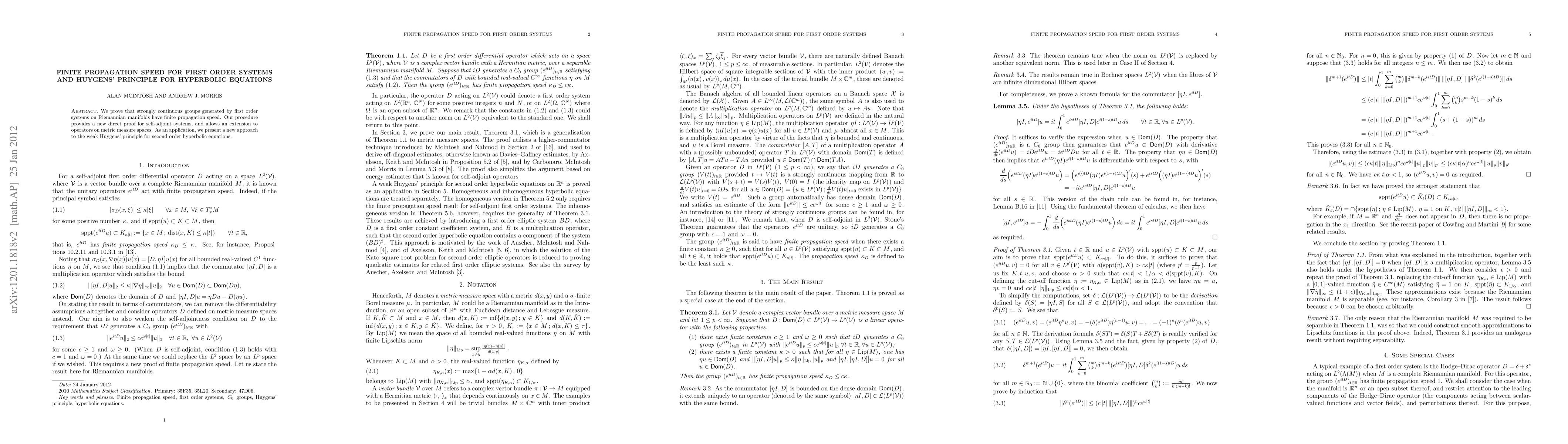 We prove that strongly continuous groups generated by first order systems on Riemannian manifolds have finite propagation speed. Our procedure provides a new direct proof for self-adjoint systems, and allows an extension to operators on metric measure spaces. As an application, we present a new approach to the weak Huygens' principle for second order hyperbolic equations.