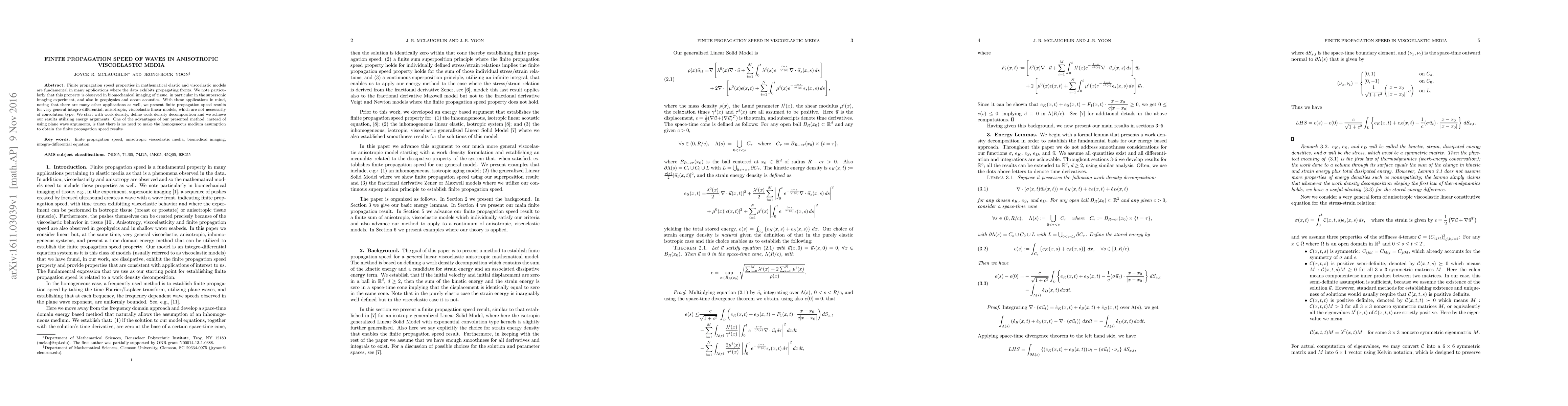 Finite propagation speed properties in mathematical elastic and viscoelastic models are fundamental in many applications where the data exhibits propagating fronts. We note particularly that this property is observed in biomechanical imaging of tissue, in particular in the supersonic imaging experiment, and also in geophysics and ocean acoustics. With these applications in mind, noting that there are many other applications as well, we present finite propagation speed results for very general integro-differential, anisotropic, viscoelastic linear models, which are not necessarily of convolution type. We start with work density, define work density decomposition and we achieve our results utilizing energy arguments. One of the advantages of our presented method, instead of using plane wave arguments, is that there is no need to make the homogeneous medium assumption to obtain the finite propagation speed results.