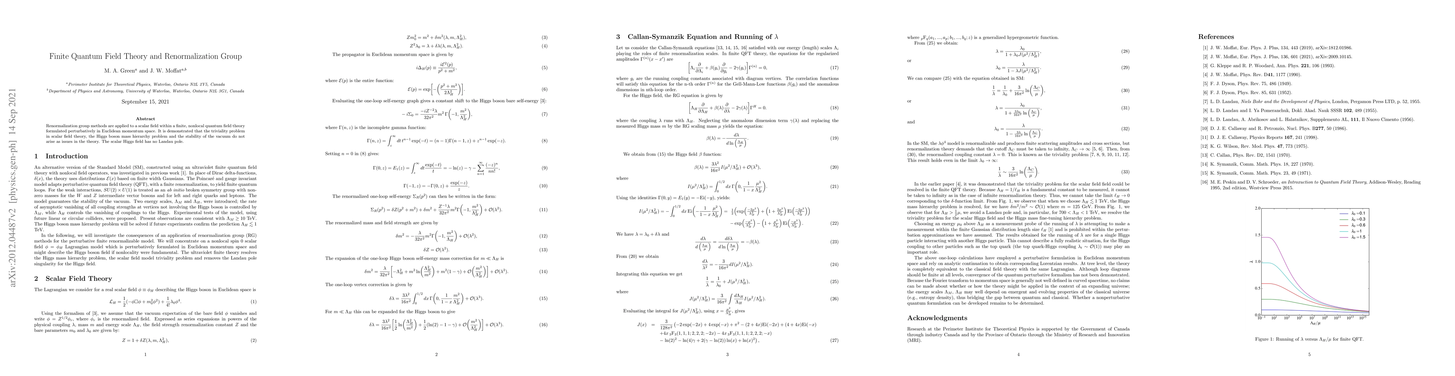 This paper applies renormalization group methods to a finite, nonlocal quantum field theory, showing that it resolves the triviality problem, Higgs boson mass hierarchy issue, and vacuum stability concerns, with the scalar Higgs field lacking a Landau pole.