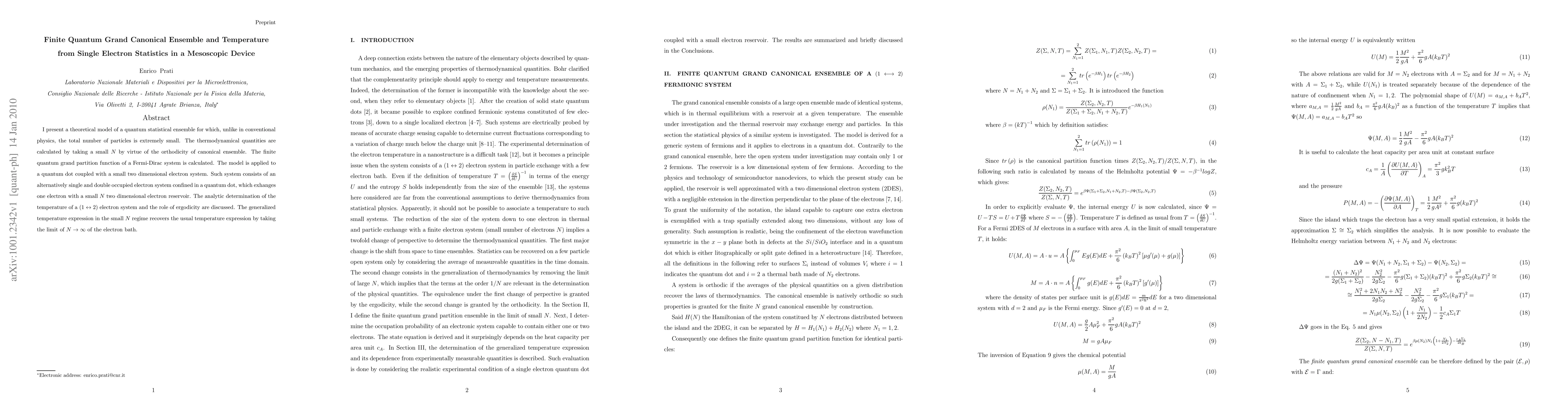 I present a theoretical model of a quantum statistical ensemble for which, unlike in conventional physics, the total number of particles is extremely small. The thermodynamical quantities are calculated by taking a small $N$ by virtue of the orthodicity of canonical ensemble. The finite quantum grand partition function of a Fermi-Dirac system is calculated. The model is applied to a quantum dot coupled with a small two dimensional electron system. Such system consists of an alternatively single and double occupied electron system confined in a quantum dot, which exhanges one electron with a small $N$ two dimensional electron reservoir. The analytic determination of the temperature of a $(1\leftrightarrow 2)$ electron system and the role of ergodicity are discussed. The generalized temperature expression in the small $N$ regime recovers the usual temperature expression by taking the limit of $N\to\infty$ of the electron bath.
