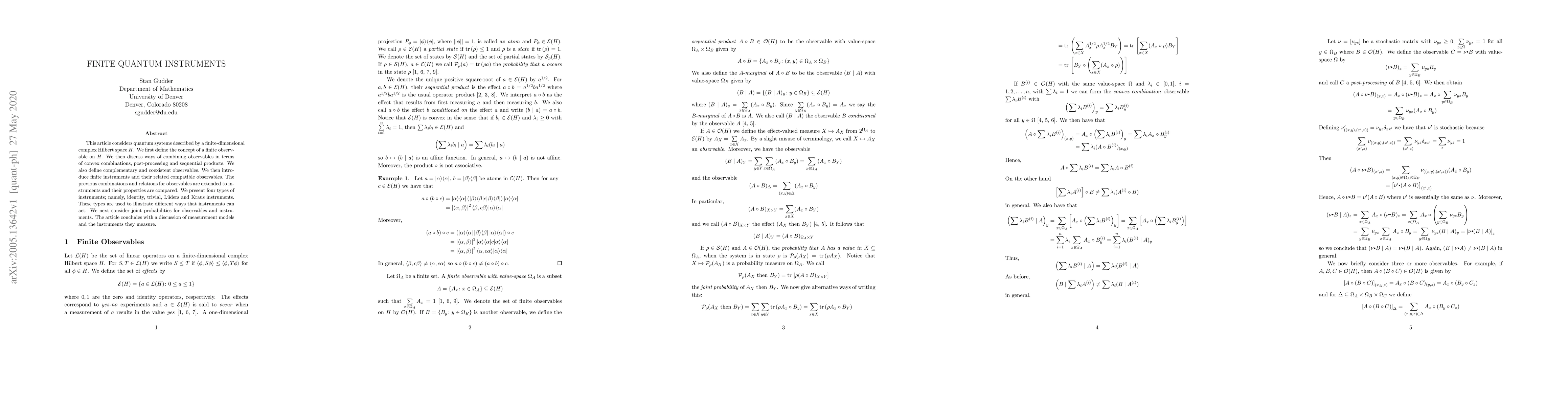 This paper explores finite quantum instruments within finite-dimensional Hilbert spaces, defining and combining observables, and introducing four types of instruments: identity, trivial, Lüders, and Kraus, to illustrate their distinct measurement actions. The study also examines joint probabilities and measurement models.