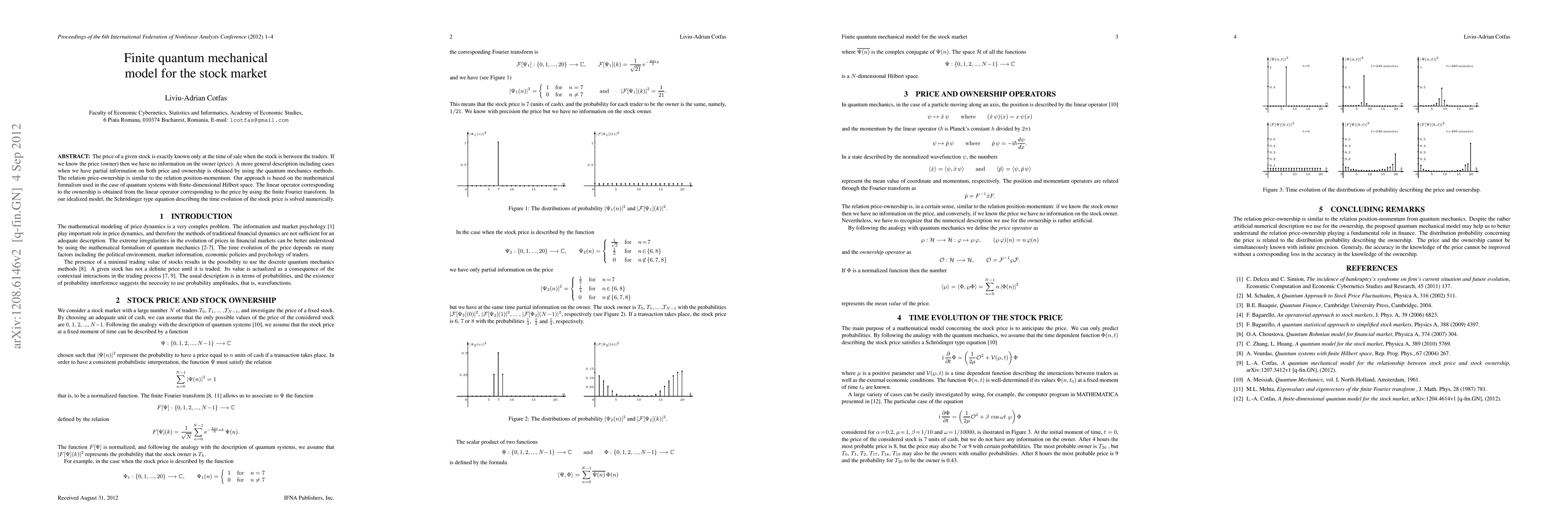 The paper introduces a finite quantum mechanical model for stock market dynamics, utilizing a finite-dimensional Hilbert space and the finite Fourier transform to describe the relationship between stock price and ownership.
