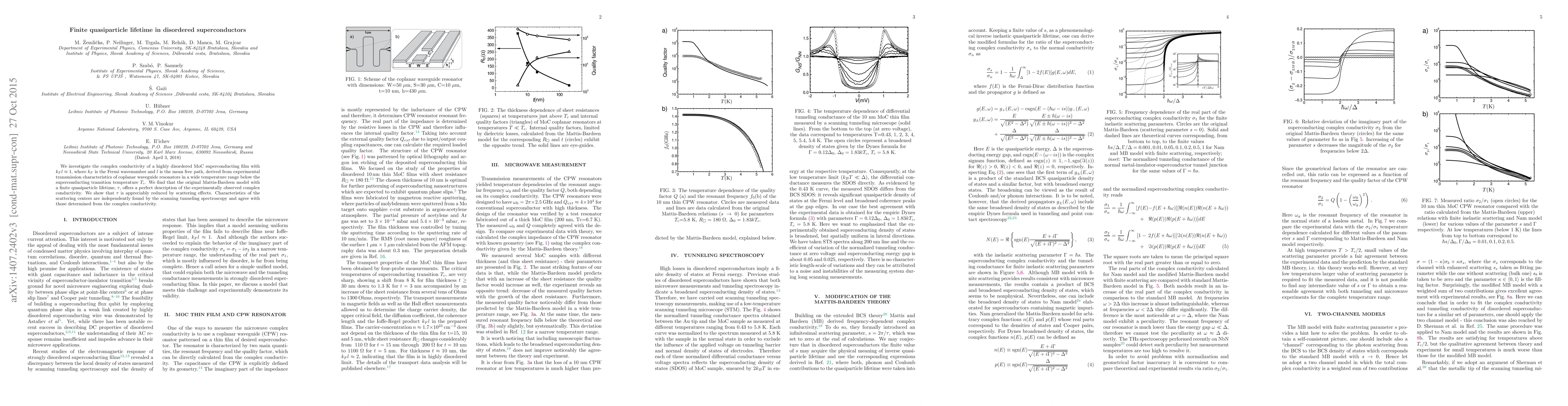 This study examines the complex conductivity of a disordered MoC superconducting film, finding that the Mattis-Bardeen model with a finite quasiparticle lifetime $\tau$ accurately describes the observed behavior. The reduced $\tau$ is attributed to scattering effects, with independent verification from scanning tunneling spectroscopy.