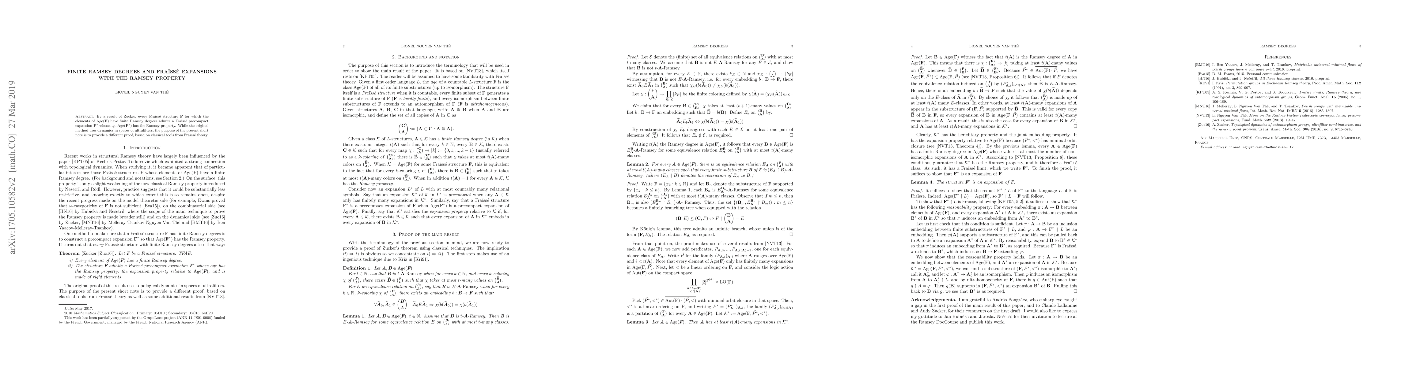 By a result of Zucker, every Fra\"iss\'e structure $\bf F$ for which the elements of $\mathrm{Age}(\bf F)$ have finite Ramsey degrees admits a Fra\"iss\'e precompact expansion $\bf F^{*}$ whose age $\mathrm{Age}(\bf F^{*})$ has the Ramsey property. While the original method uses dynamics in spaces of ultrafilters, the purpose of the present short note is to provide a different proof, based on classical tools from Fra\"iss\'e theory.