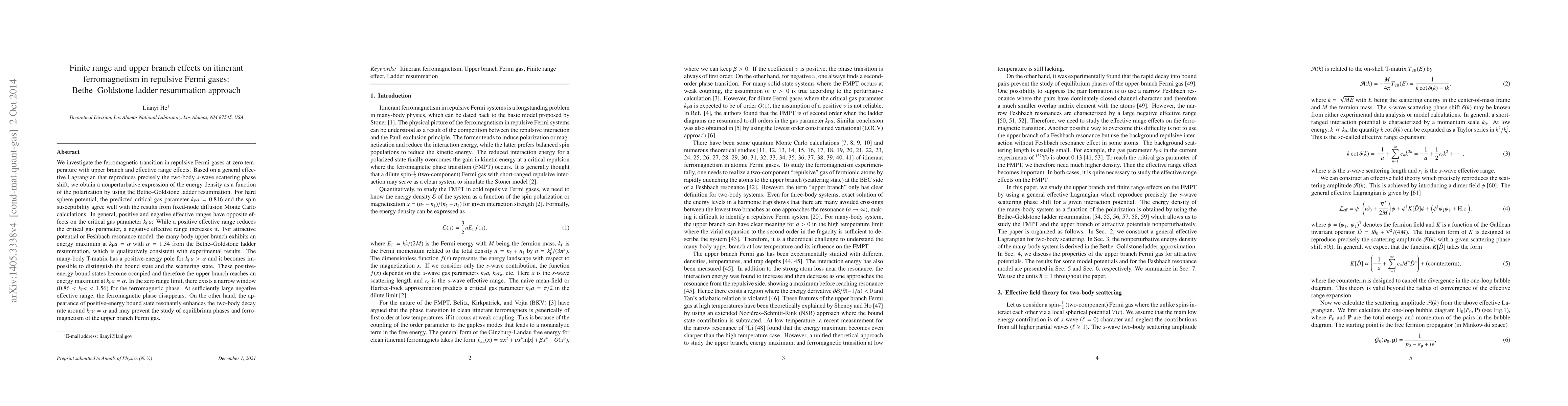 The paper explores ferromagnetism in repulsive Fermi gases at zero temperature, considering upper branch and effective range effects. Utilizing a general effective Lagrangian and Bethe-Goldstone ladder resummation, it derives a nonperturbative energy density expression. The findings reveal that positive effective ranges decrease the critical gas parameter, while negative ones increase it. For attractive potentials, an energy maximum at kF*a=1.34 is predicted, aligning with experiments. However, positive-energy bound states near this maximum may complicate the study of equilibrium phases and ferromagnetism.