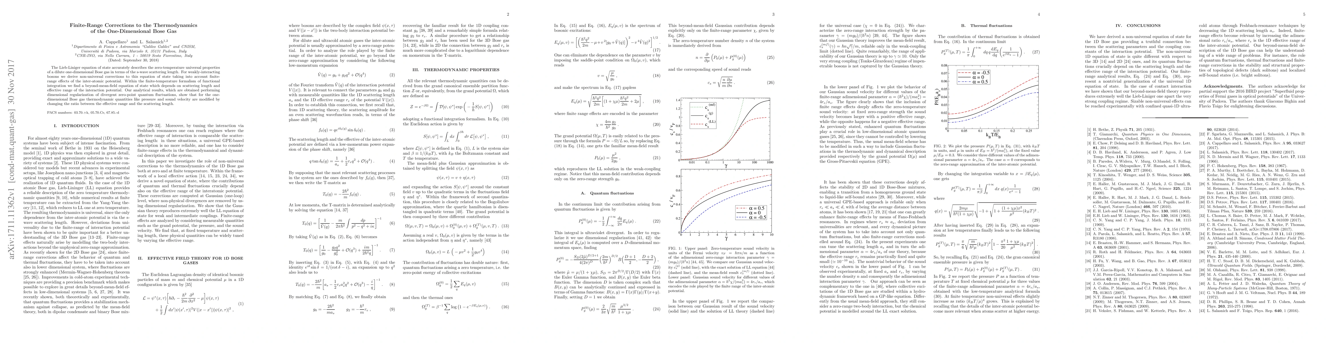 This paper derives non-universal finite-range corrections to the Lieb-Liniger equation of state for a one-dimensional Bose gas, considering the effective range of inter-atomic interactions. The beyond-mean-field equation of state, obtained through functional integration and dimensional regularization, reveals modifications in thermodynamic properties like pressure and sound velocity based on the ratio of effective range to scattering length.
