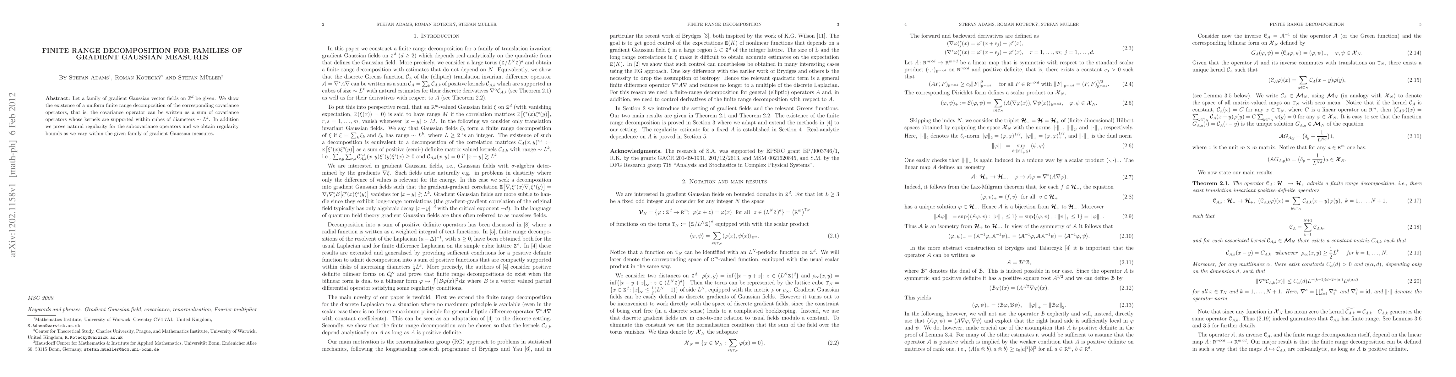 Let a family of gradient Gaussian vector fields on $ \mathbb{Z}^d $ be given. We show the existence of a uniform finite range decomposition of the corresponding covariance operators, that is, the covariance operator can be written as a sum of covariance operators whose kernels are supported within cubes of diameters $ \sim L^k $. In addition we prove natural regularity for the subcovariance operators and we obtain regularity bounds as we vary within the given family of gradient Gaussian measures.