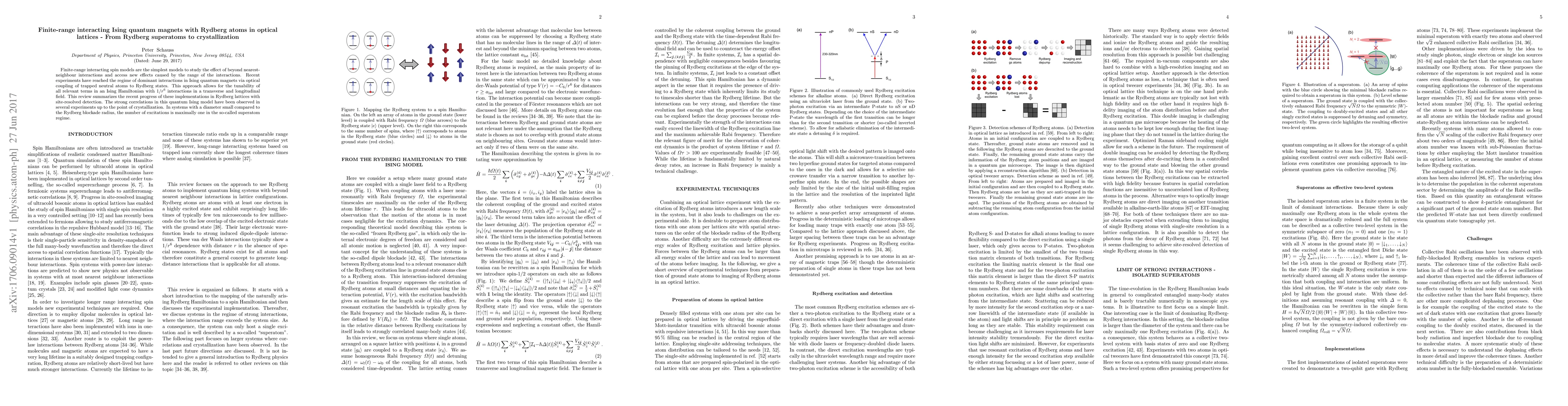 Finite-range interacting spin models are the simplest models to study the effect of beyond nearest-neighbour interactions and access new effects caused by the range of the interactions. Recent experiments have reached the regime of dominant interactions in Ising quantum magnets via optical coupling of trapped neutral atoms to Rydberg states. This approach allows for the tunability of all relevant terms in an Ising Hamiltonian with $1/r^6$ interactions in a transverse and longitudinal field. This review summarizes the recent progress of these implementations in Rydberg lattices with site-resolved detection. The strong correlations in this quantum Ising model have been observed in several experiments up to the point of crystallization. In systems with a diameter small compared to the Rydberg blockade radius, the number of excitations is maximally one in the so-called superatom regime.
