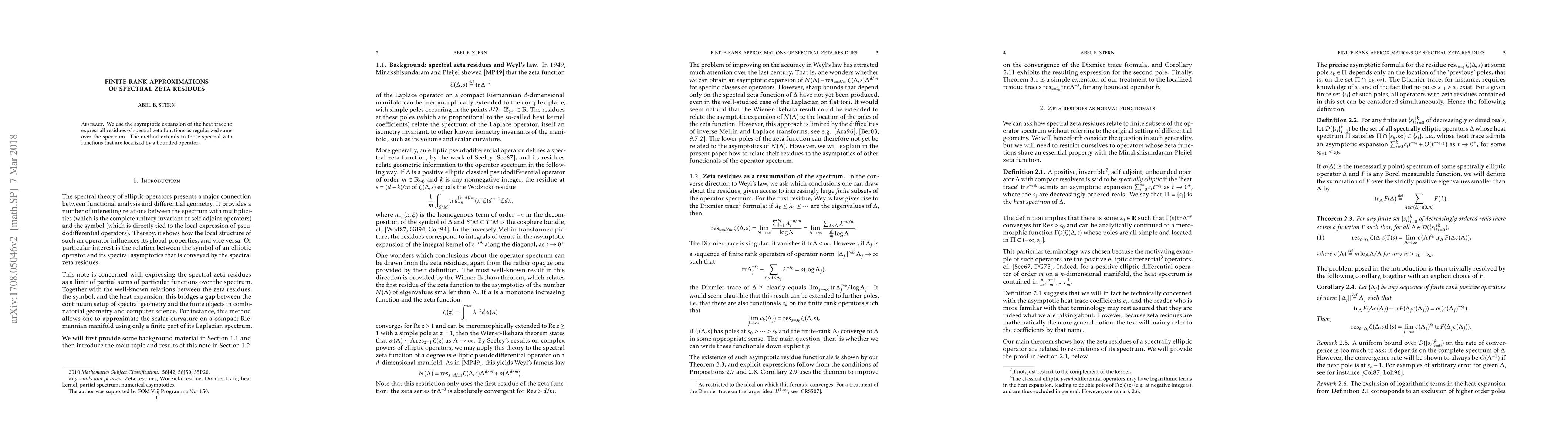 This paper proposes a method for approximating spectral zeta residues using the asymptotic expansion of the heat trace, expressed as regularized sums over the spectrum. The approach is extended to spectral zeta functions localized by a bounded operator.