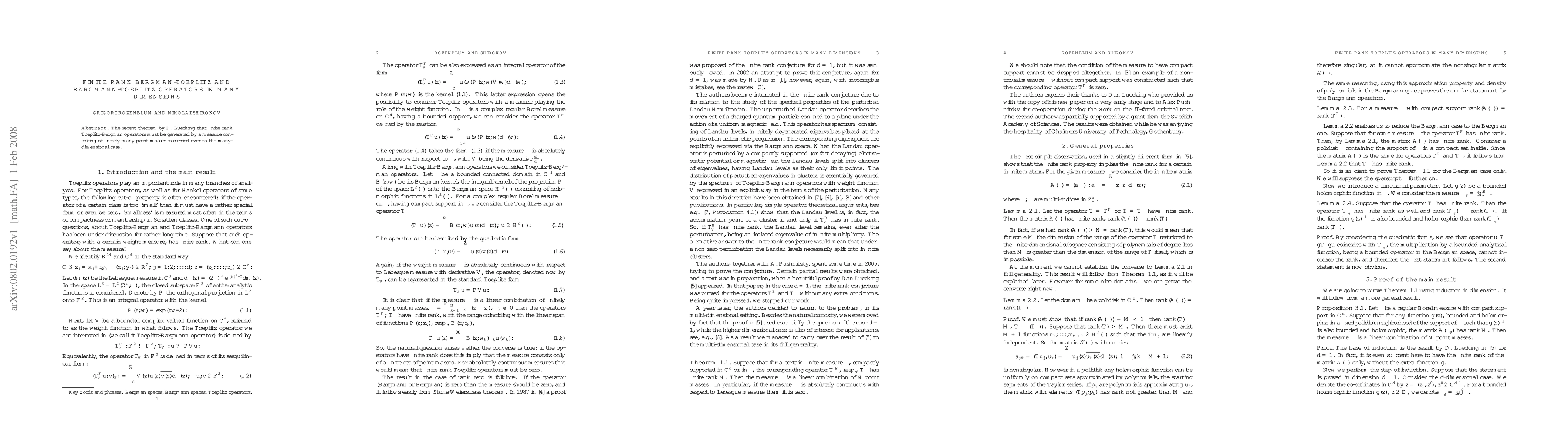 The recent theorem by D. Luecking that finite rank Toeplitz-Bergman operators must be generated by a measure consisting of finitely many point masses is carried over to the many-dimensional case.