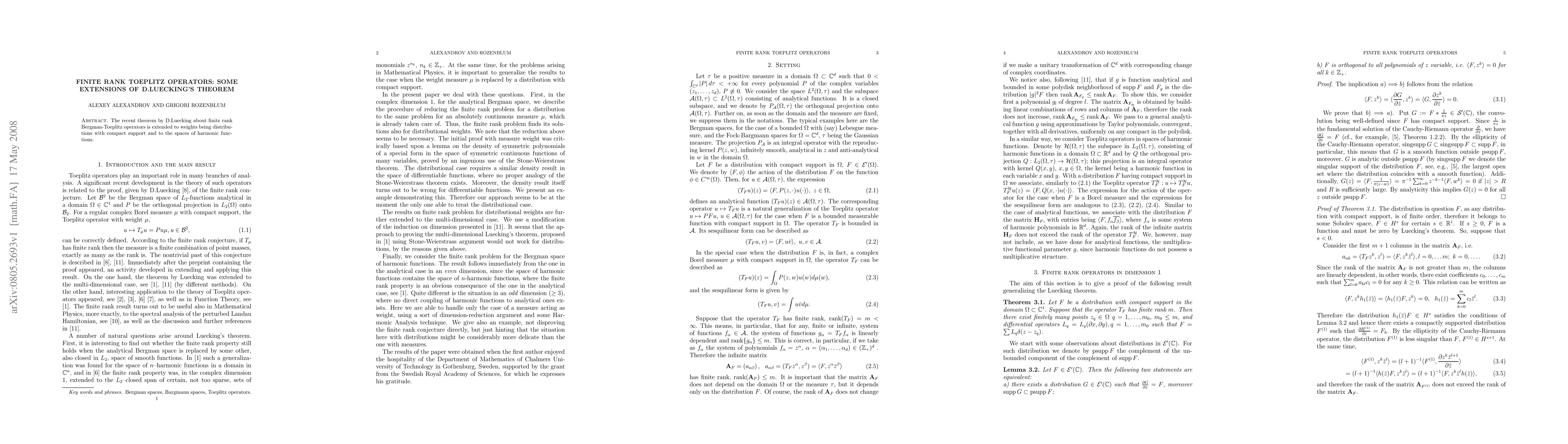 The recent theorem by D.Luecking about finite rank Bergman-Toeplitz operators is extended to weights being distributions with compact support and to the spaces of harmonic functions.