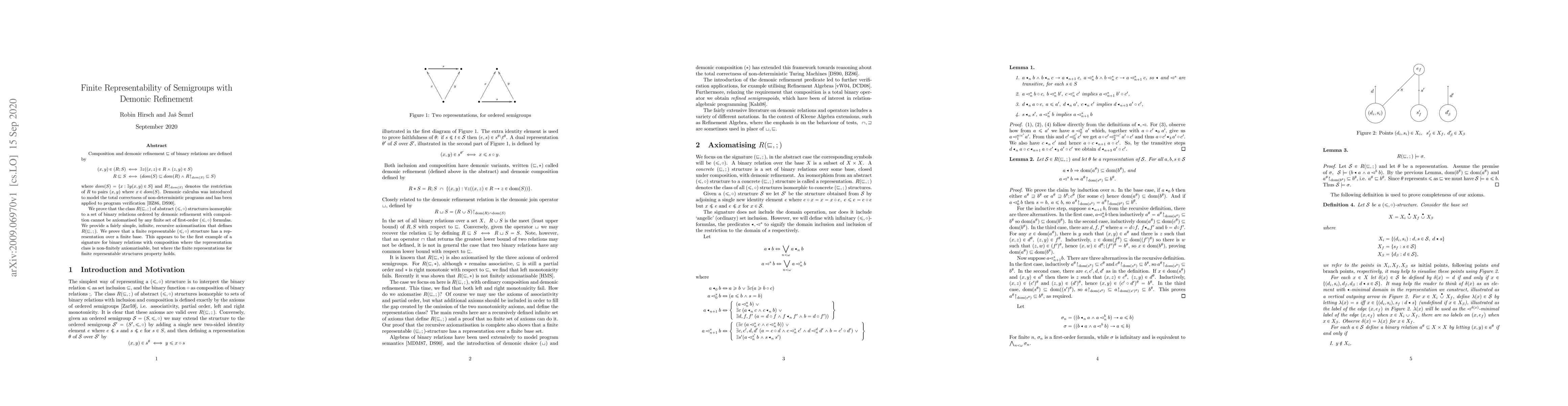 Composition and demonic refinement $\sqsubseteq$ of binary relations are defined by \begin{align*} (x, y)\in (R;S)&\iff \exists z((x, z)\in R\wedge (z, y)\in S) R\sqsubseteq S&\iff (dom(S)\subseteq dom(R) \wedge R\restriction_{dom(S)}\subseteq S) \end{align*} where $dom(S)=\{x:\exists y (x, y)\in S\}$ and $R\restriction_{dom(S)}$ denotes the restriction of $R$ to pairs $(x, y)$ where $x\in dom(S)$. Demonic calculus was introduced to model the total correctness of non-deterministic programs and has been applied to program verification. We prove that the class $R(\sqsubseteq, ;)$ of abstract $(\leq, \circ)$ structures isomorphic to a set of binary relations ordered by demonic refinement with composition cannot be axiomatised by any finite set of first-order $(\leq, \circ)$ formulas. We provide a fairly simple, infinite, recursive axiomatisation that defines $R(\sqsubseteq, ;)$. We prove that a finite representable $(\leq, \circ)$ structure has a representation over a finite base. This appears to be the first example of a signature for binary relations with composition where the representation class is non-finitely axiomatisable, but where the finite representations for finite representable structures property holds.