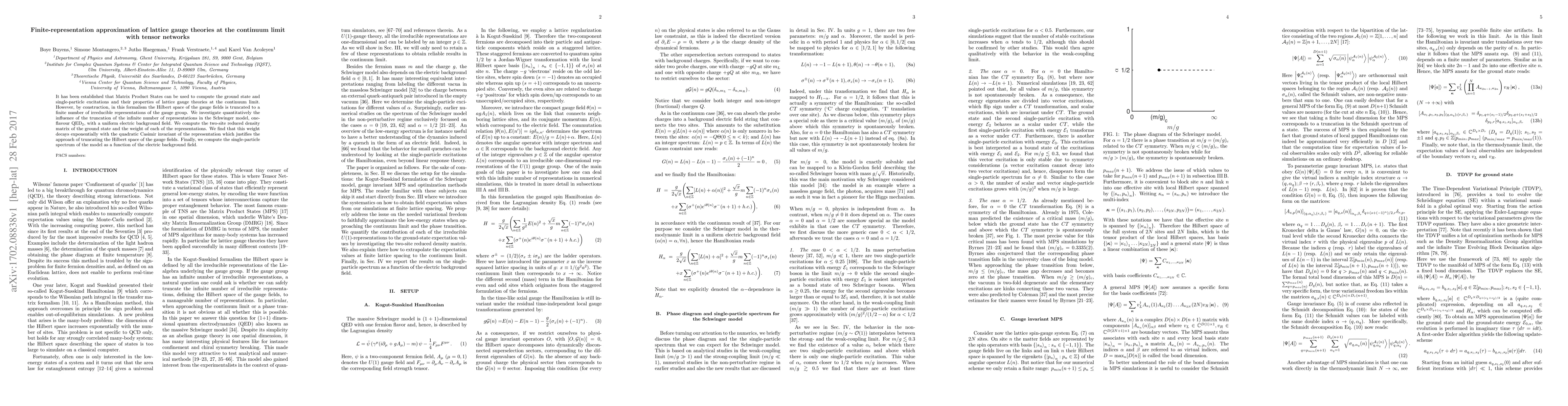 This paper investigates the finite-representation approximation of lattice gauge theories using tensor networks, focusing on the Schwinger model and one-flavour QED$_2$. It finds that the weight of truncating the infinite number of representations decays exponentially, justifying the approximation, and computes the single-particle spectrum under an electric background field.