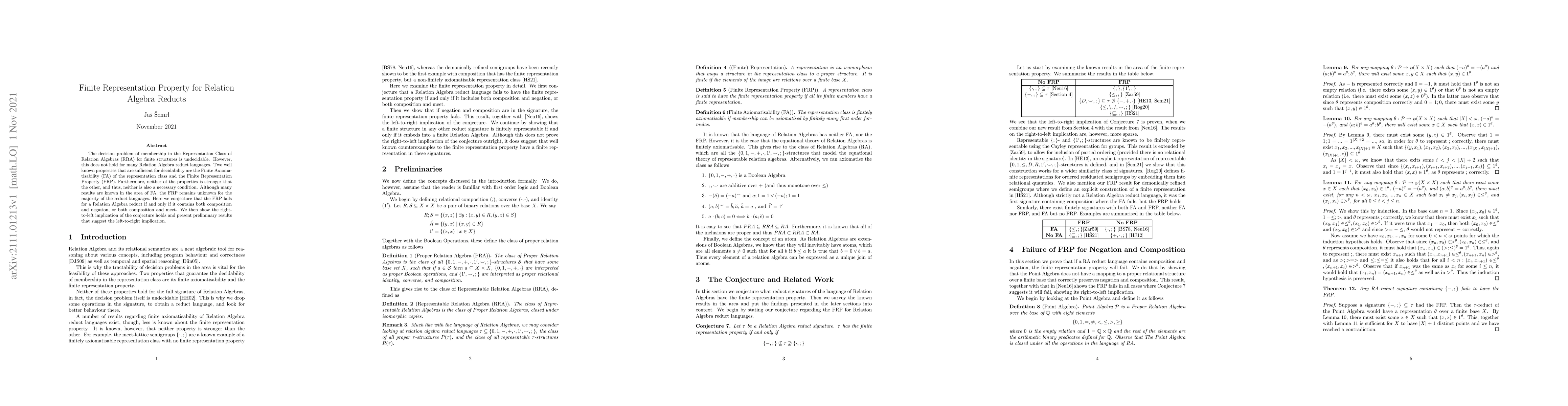 The decision problem of membership in the Representation Class of Relation Algebras (RRA) for finite structures is undecidable. However, this does not hold for many Relation Algebra reduct languages. Two well known properties that are sufficient for decidability are the Finite Axiomatisability (FA) of the representation class and the Finite Representation Property (FRP). Furthermore, neither of the properties is stronger that the other, and thus, neither is also a necessary condition. Although many results are known in the area of FA, the FRP remains unknown for the majority of the reduct languages. Here we conjecture that the FRP fails for a Relation Algebra reduct if and only if it contains both composition and negation, or both composition and meet. We then show the right-to-left implication of the conjecture holds and present preliminary results that suggest the left-to-right implication.
