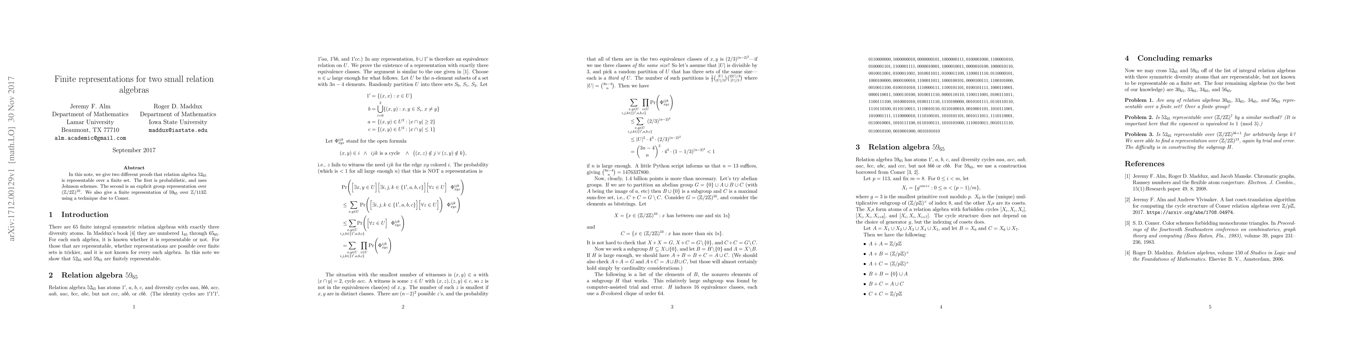 In this note, we give two different proofs that relation algebra $52_{65}$ is representable over a finite set. The first is probabilistic, and uses Johnson schemes. The second is an explicit group representation over $ (\mathbb{Z}/2\mathbb{Z})^{10}$. We also give a finite representation of $59_{65}$ over $\mathbb{Z}/113\mathbb{Z}$ using a technique due to Comer.