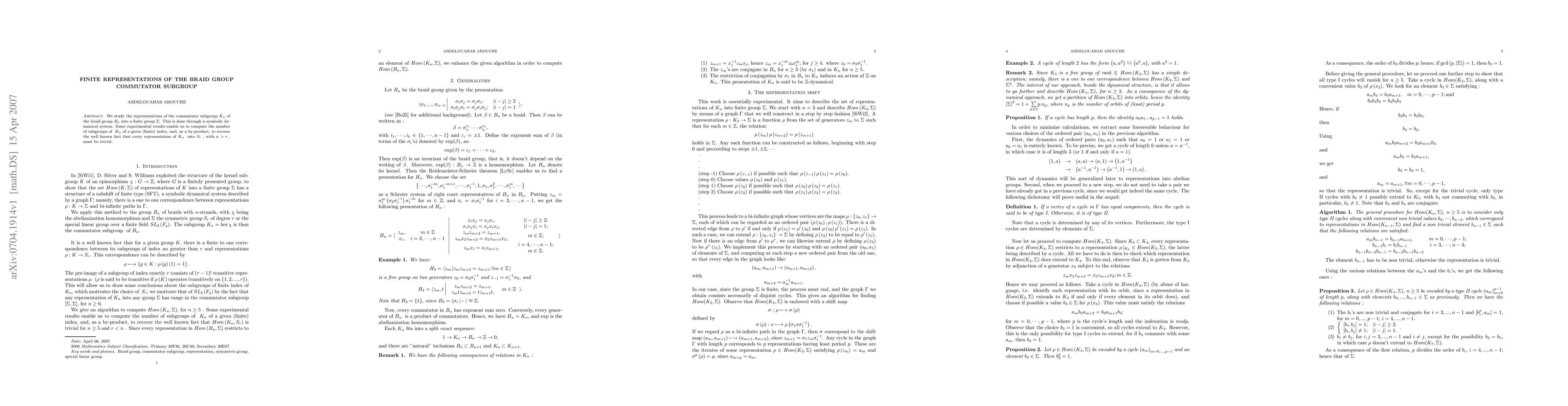 We study the representations of the commutator subgroup K_{n} of the braid group B_{n} into a finite group . This is done through a symbolic dynamical system. Some experimental results enable us to compute the number of subgroups of K_{n} of a given (finite) index, and, as a by-product, to recover the well known fact that every representation of K_{n} into S_{r}, with n > r, must be trivial.